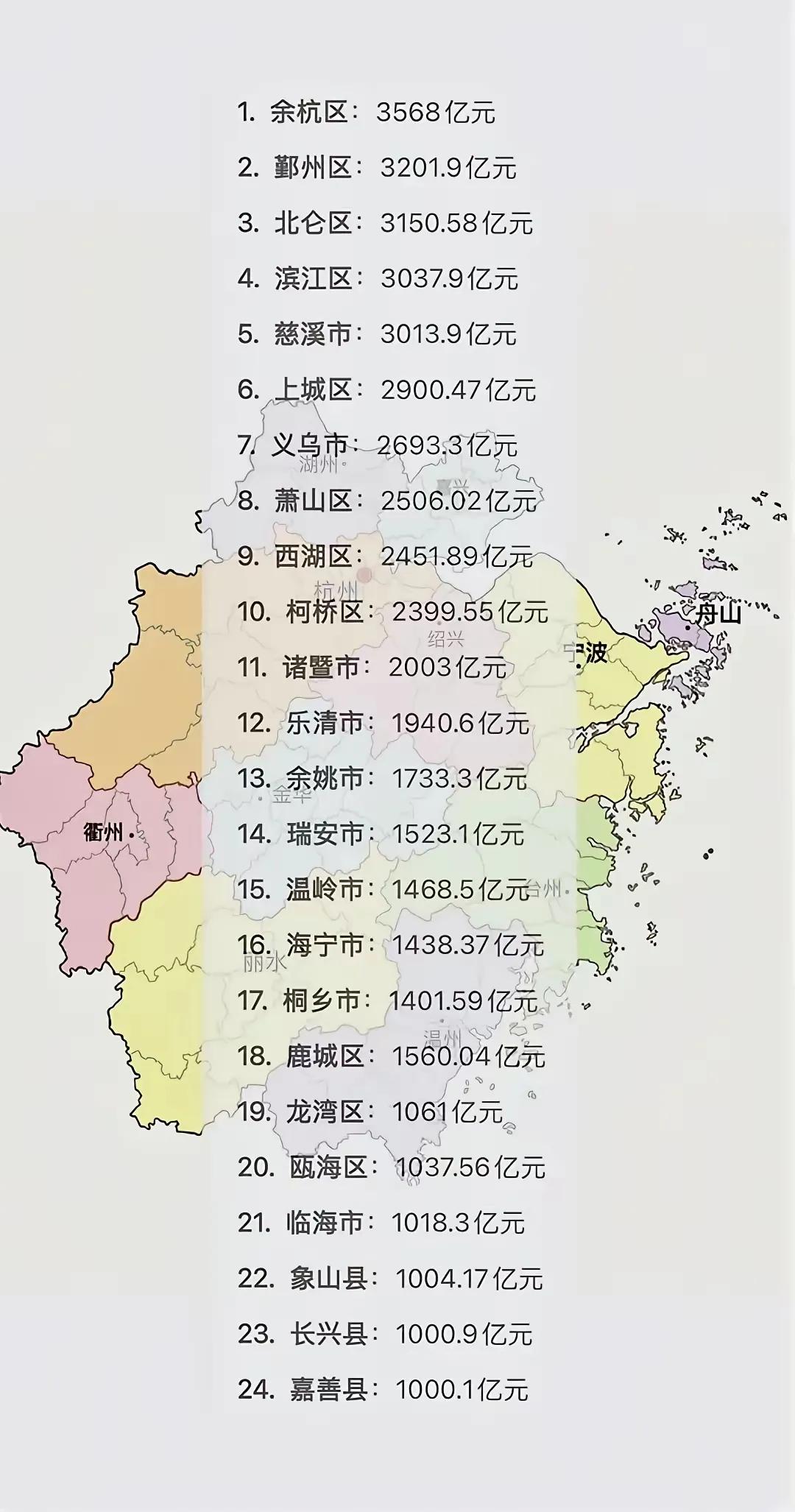 义乌超过萧山排名第七,萧山区本来也是非常棒的,在前几年被余杭超过之后就名次越来越下降了,前五名宁波地区的总共占了3名,长兴县也突破千亿大关,在长兴县呆过,对长兴县的印象很好的。以上仅供参考,属个人意见!
