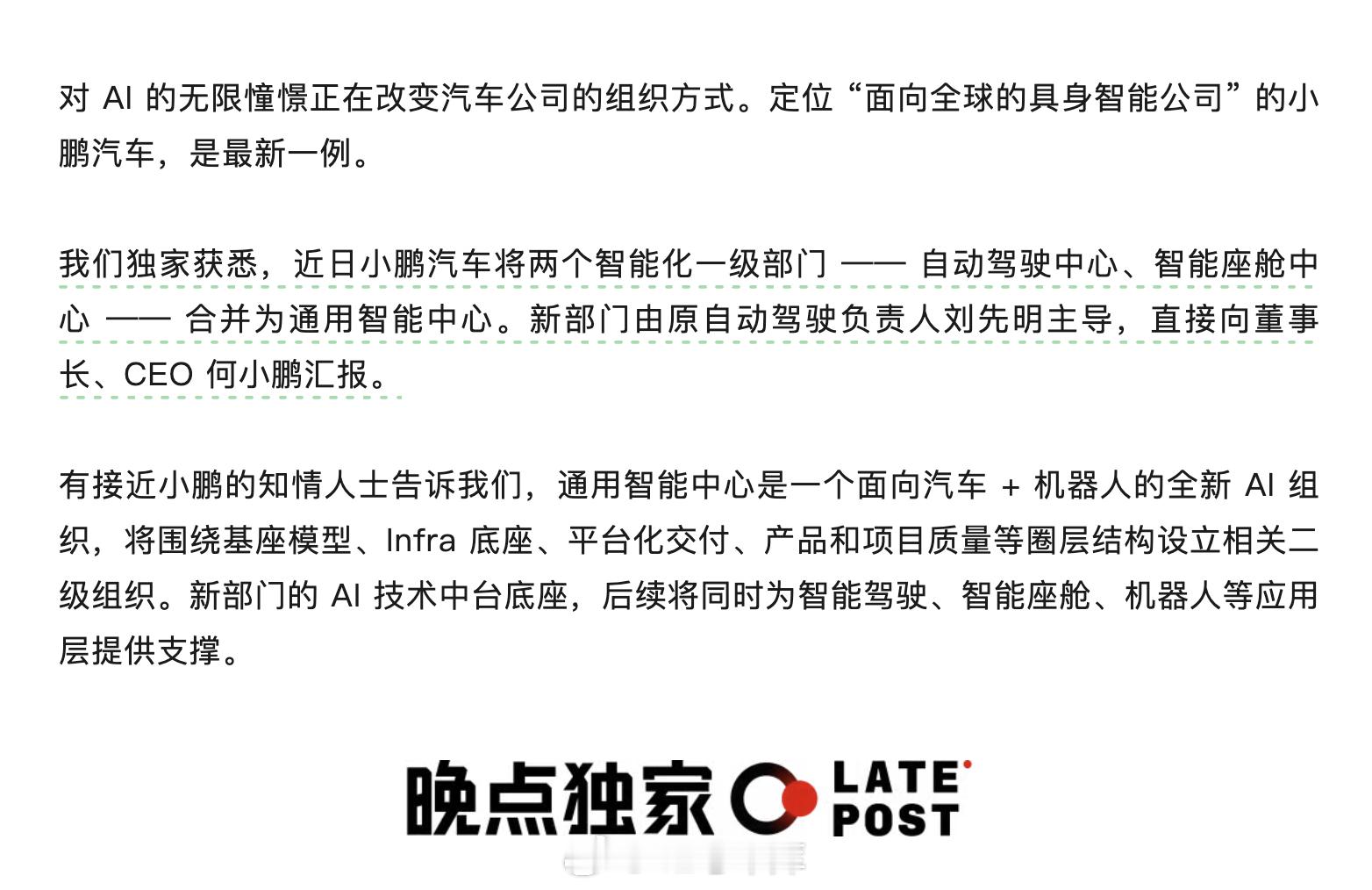 《晚点》消息,小鹏汽车将两个智能化一级部门:自动驾驶中心、智能座舱中心 —— 合并为通用智能中心。新部门由原自动驾驶负责人刘先明主导,直接向何小鹏汇报。「两大一级部门合并后,小鹏汽车的 AI 资源会更加集中,统一的 AI 中台技术底座能同时支撑智能驾驶、智能座舱、机器人等业务,资源分配更灵活,步调更协调。」