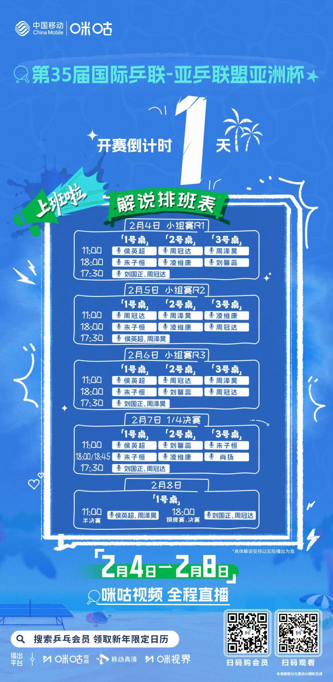 2026乒乓球亚洲杯倒计时1️⃣天🌟 大咖解说陪你看亚洲杯🍄 2月4-8日 咪咕视频全程直播🔔 今日16:00抽签仪式提前看👀#海口亚洲杯小组赛抽签仪式##看海口亚洲杯上咪咕# 👉 网页链接