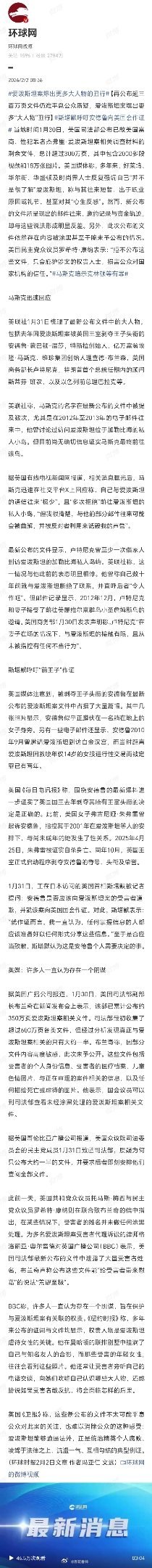 爱泼斯坦案爆出更多大人物的丑行爱泼斯坦案三百万页“密档”再揭欧美权贵画皮。文件选择性地涂黑、关键信息被隐匿,所谓“司法公开”不过是一场精心导演的公关秀。从白金汉宫到华尔街,从硅谷巨鳄到华盛顿权贵,邮件与邀约记录撕碎了“不熟悉”“仅礼节往来”的苍白辩词。