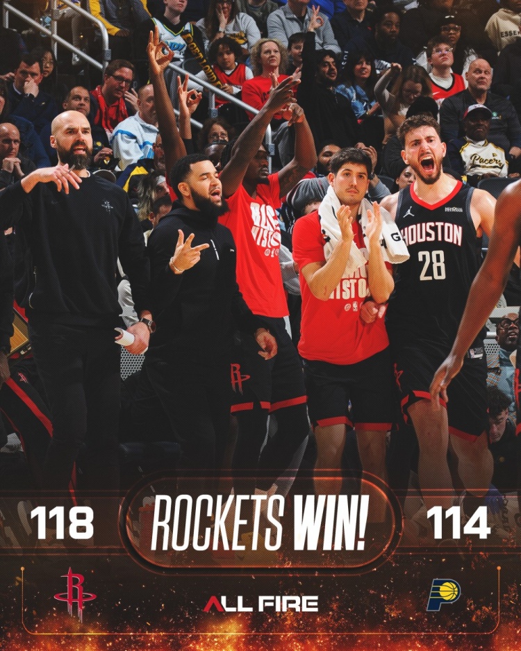 2月3日,火箭队今天战胜步行者队迎来三连胜,本场比赛火箭队以118:114险胜对手4分。其实前三节火箭队和对手打得难分难解,直到第四节最后时刻两队才决出胜负。按理说不应该如此,火箭队的实力要远胜于对手。不过,杜兰特缺阵,火箭队的这位超级得分手场均26分,少了这么一位超级前锋,火箭队和步行者队缠斗到最后一刻才赢球,其实这也是可以理解的。申京本场比赛表现不错,他也成为了火箭队本场比赛赢球的最大功臣。火箭队在赢球之后,正式发布了本场比赛的赢球海报。可以看到火箭队的谢泼德,甚至范弗里特都出现在了赢球海报当中。这也意味着,本场比赛火箭队可以说是全员发挥才战胜了步行者队,拿到了一场关键胜利,确保了火箭队稳居西部第四的排名。