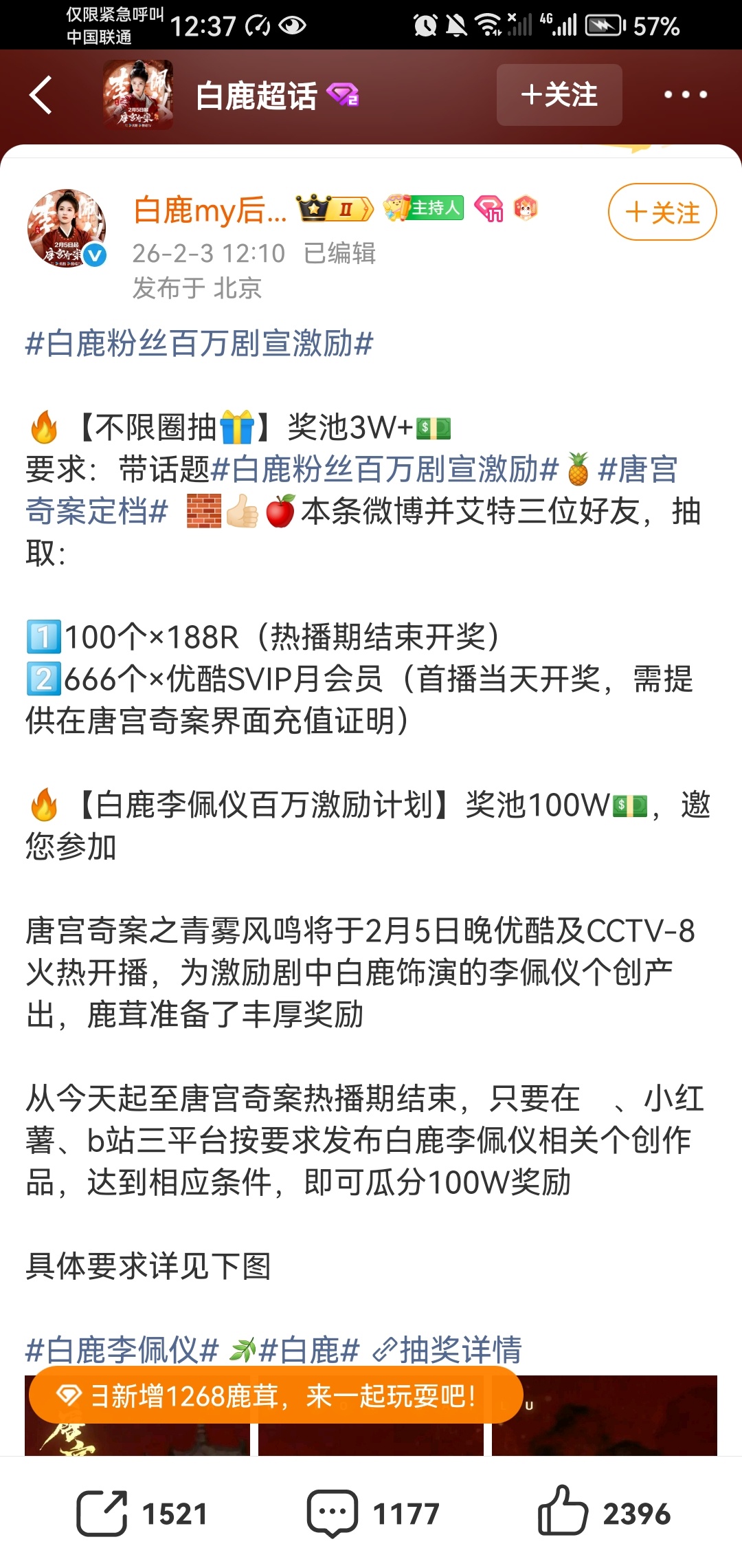 白鹿粉丝为白鹿在唐宫奇案里饰演的李佩仪准备了百万剧宣激励!是真金白银百万元!同时还有不限粉圈抽奖!白鹿粉丝百万剧宣激励