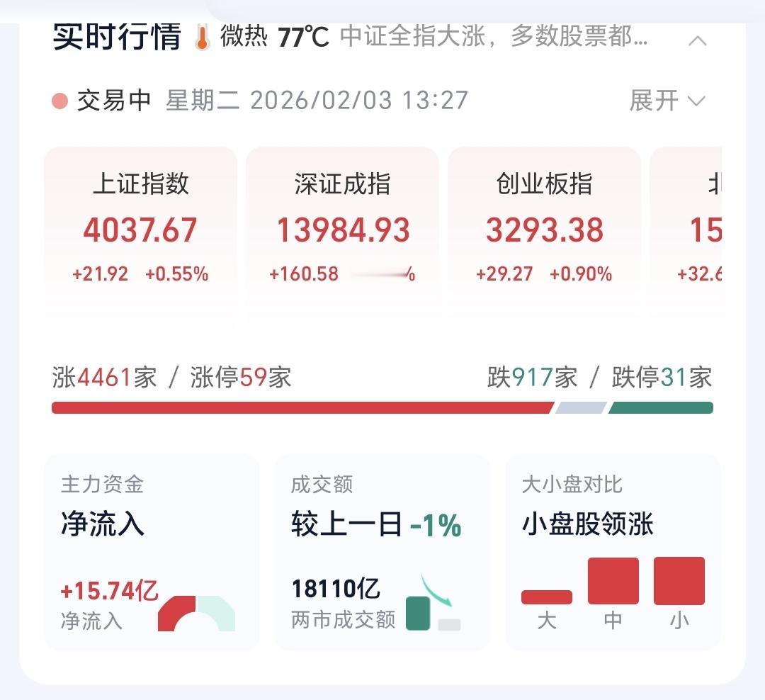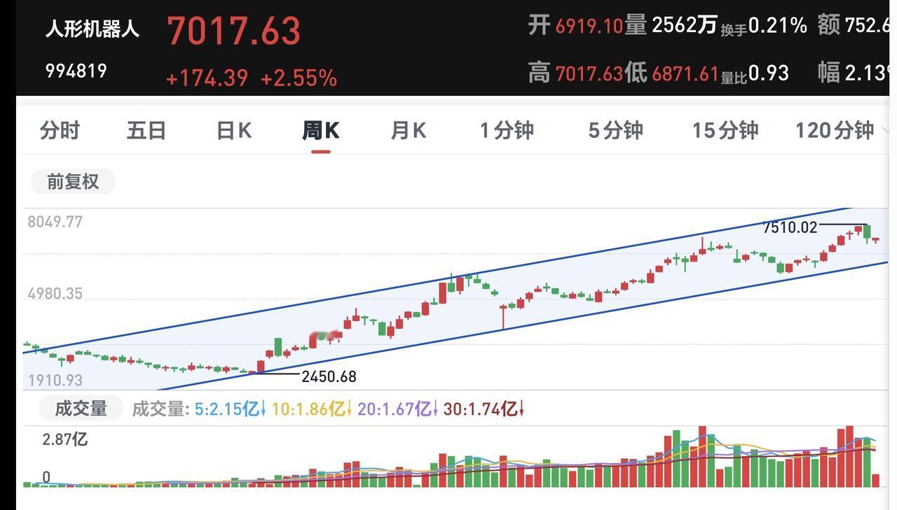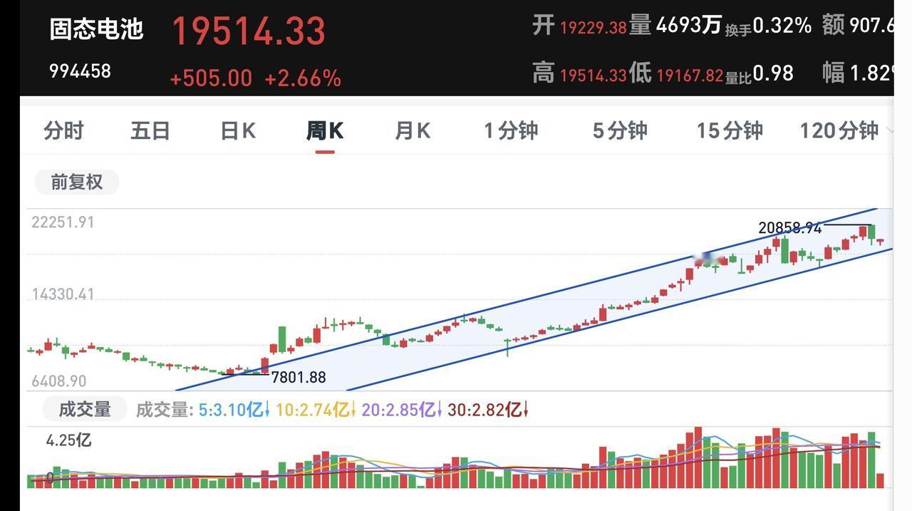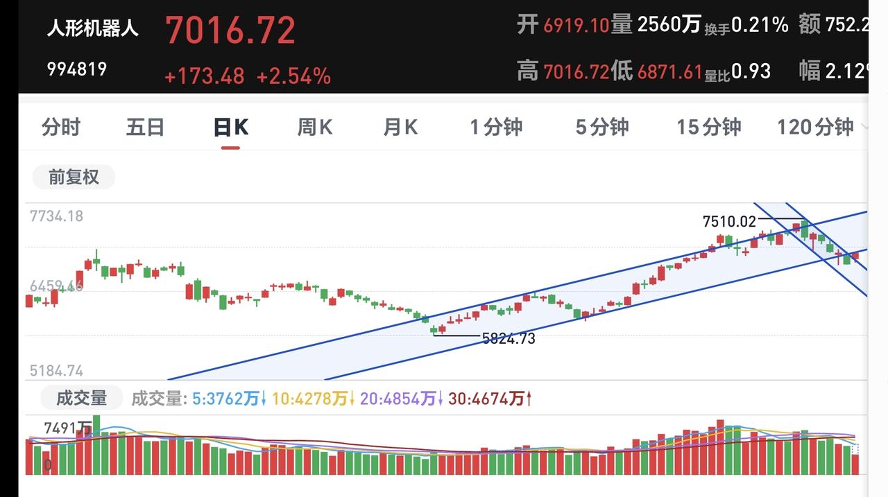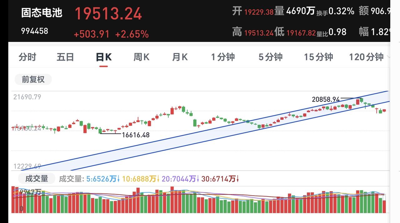 基金:机器人和固态电池板块应该怎么办 市场现在是小幅度震荡当中,三大指数都是红盘,创业板指上涨了0.93%,盘中点位3294点,上证指数上涨了0.57%,盘中点位4038点。 黄色线还是在蓝色线上方,两条线之间的敞口还是比较大,这就加大了今天盘中跳水的难度,今天关键的走势还是在两点钟之后,特别是在两点半左右。 两市累计成交18110亿,相比于昨天同期缩量了1%,中午收盘的时候缩量幅度是2%,说明下午开盘之后是有资金在进场,但进场的幅度不大,资金这样的进场幅度,不支持市场有大幅度的上涨,到现在为止,市场的上涨还是在反弹的范围之内,还是在弱反弹的范围之内。 市场上涨4400多家,下跌900多家,涨停59家,跌停31家,主力资金净流入15亿,净流入的幅度比较小,可以忽略不计。 看下面的截图5,这是主力资金进出板块的情况,主力资金净流入最多的三个板块是:军工板块,光伏板块,机器人板块,主力资金净流出最多的三个板块是:Esg板块,大科技板块,有色金属板块。 看下面的截图6,这是机器人板块日K线图,今天上涨突破了日线级别短期下跌通道的上轨线,短线持有的人可以继续持有,短线想进场的人也可以考虑进场。 看下面的截图7,这次机器人板块周K线图,现在的位置处于上涨通道中,长线持有的人可以继续持有,机器人板块大方向向上。 看下面的截图8,这是固态电池板块日K线图,前段时间下跌跌破了上涨通道的下轨线,现在是在上涨通道下方震荡,并没有能够收回到上涨通道内,也就是日线级别上涨趋势已经被破坏。 看下面的截图9,这是固态电池板块周K线图,现在的位置处于这个上涨通道内,距离上涨通道的下轨线比较近,长线持有的人可以继续持有。 持有的基金中,估值上涨幅度最大的三个板块是:可控核聚变板块,军工板块,AI应用板块,下跌幅度最大的三个板块是:医疗板块,证券板块,白酒板块,估值整体上涨了4269元。 今天观察能不能站稳4039点,在站上4039点的过程当中有没有放量,没有放量的上涨,终究还会是反弹。 每天两点钟左右,我会分享我的观点,我的观点只代表我个人的看法,不能作为你操作的依据,据此操作后果自负。