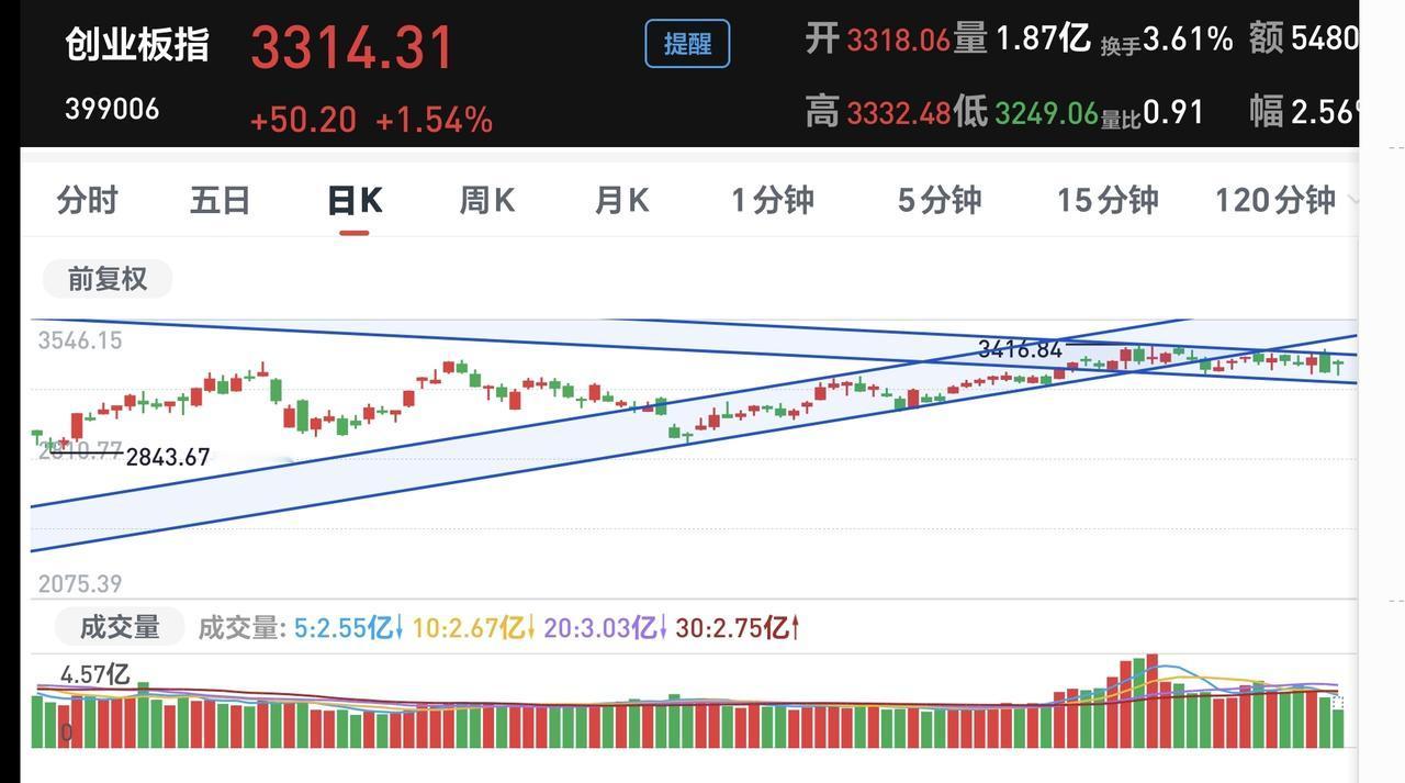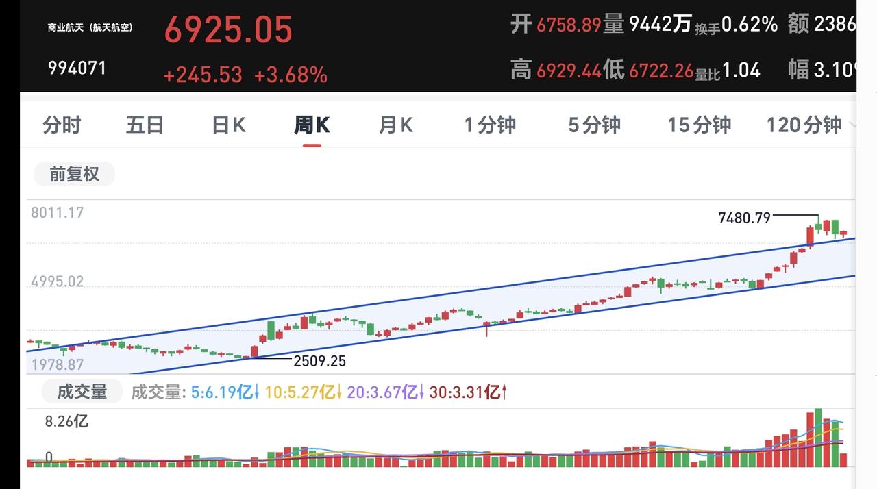 基金:商业航天板块应该怎么办 市场指数继续上涨中,创业板指和深成指上涨幅度都超过了1%以上,创业板指上涨了1.54%盘中点位3314点,上证指数上涨了0.90%,盘中点位4052点,超过了我给出的4039点的压力位置,收盘之前观察能不能站稳4039点。 我们再来看一下下面的截图2,这是上证指数日K线图,今天的上涨,来到了下跌通道下轨线附近,即使突破了下跌通道的下轨线,也还是处于日线级别短期下跌趋势中,只有上涨突破下跌通道上轨线才是有效的上涨。 我们再来看一下下面的截图3,这是创业板指日K线图,今天的上涨还是处于日线级别短期下跌通道中,并没有能够突破下跌通道的上轨线,在突破下跌通道上轨线之前,都还是处于下跌趋势中,也就是今天的上涨并没有能够改变日线级别短期的下跌趋势。 我们再来看一下盘面情况,现在两市累计成交20605亿,相比于昨天同期数量了2%,说明在这一轮的反弹过程当中是缩量的,因为,下午开盘之后缩量的幅度是1%,现在又到了2%的缩量幅度,市场上涨4500多家,下跌800多家,涨停67家,跌停29家,主力资金净流入84亿。 整个市场上涨幅度最大的三个板块是:光伏板块,电网设备板块,商业航天板块,商业航天板块现在盘中估值上涨了3.32%,持有人数在所有板块当中排名第四位。 看下面的截图6,这是商业航天板块日K线图,今天的上涨并没有能够突破日线级别短期下跌通道的上轨线,还是处于下跌通道中。也就是说,这个板块现在还是处于日线级别短期下跌趋势中。 看下面的截图7,这是商业航天板块周K线图,前段时间上涨突破了上涨通道的上轨线,现在是震荡回落至上涨通道上轨线上方,这个板块周线级别还是处于上涨趋势中,长线持有的人可以继续持有。 持有的基金中,估值上涨幅度最大的三个板块是:可控核聚变板块,军工板块,新能源汽车板块,下跌幅度最大的三个板块是:创新药板块,证券板块,白酒板块,估值整体上涨了6962元。 今天究竟应该怎么办?我会在评论区留言。 花一秒钟点赞,花30秒钟评论就是对我最大的支持,谢谢大家的支持。