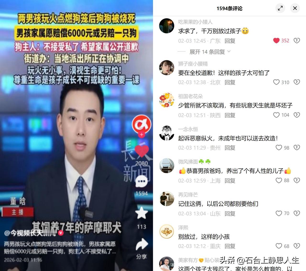 男孩纵火烧死七年萨摩耶 监控画面扎心:俩男孩把点燃的烟花扔进狗笼,看着里面的萨摩耶惨叫3分钟直到没声,转头还拿烟花追着小区母鸡取乐。事后家长只愿凑6000块或赔一只狗,说“不就是条狗”,狗主人要公开道歉,被直接拒绝。邻居还说,这俩孩子之前就虐过猫和兔子,不是第一次下手。 这事儿哪是孩子玩火这么简单。很多家长总拿年纪小不懂事当挡箭牌,却从来没教过孩子最基本的,尊重生命。只教他们争输赢、抢利益,却没告诉他们,欺负弱小算不上能耐,反倒是骨子里的恶被纵容。 今天敢对无力反抗的动物下手,明天难保不会把恶意对准人。孩子还小从来就成不了免罪金牌,更像是家长逃避教育责任的遮羞布。身边多少这样的熊孩子,背后站着的都是懒得管的熊家长,等恶真的失控,再后悔就晚了。