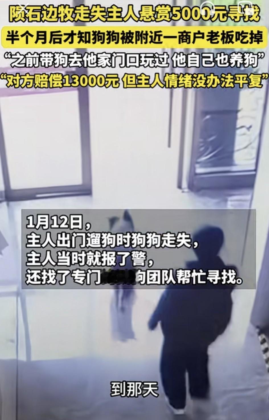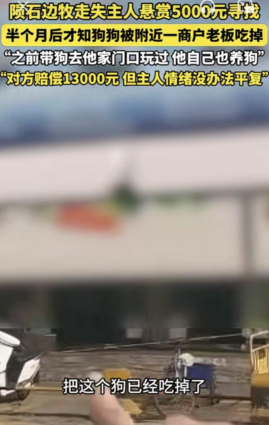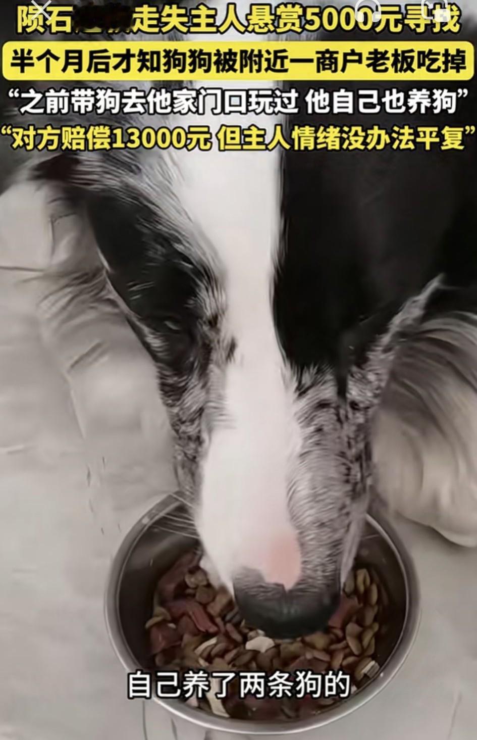 太坏了!广东中山,一狗主人养的一只陨石边牧走失,主人因此悬赏5000元寻找。不料半个月后才知,狗子走失第二天,就被附近一商户老板给吃掉了。关键是,主人不但与老板认识,这老板也知道狗是主人养的,而且老板也养着两只狗,但万万没有想到的是,老板爱狗却还要吃狗! 据寻狗志愿者描述,1月12日那天,主人出门遛狗时狗子就走失,当时主人就报了警,还找了专门的找狗团队帮忙寻找,并贴出寻狗告示,但这期间也一直没有狗子消息。 直到半个月后,警方才给主人打电话,说是找狗子线索了,狗子失踪那天去了涉事老板家店铺,之后就再也没有出来过。 而警方找到老板本人时,老板却无奈的拿不出狗来,因为狗子失踪的第二天,老板便将狗给炖来吃了。 面对这个结果,狗主人非常伤心,并狗子听话又忠诚,平日里更是将其当家人来待,没想到居然被心怀不轨的老板给吃了! 更让大家没想到的是,这老板自己也养了两只狗,也算是个爱狗人士,而且还认识狗主人和狗,但他却还要吃狗。 事情后续,经过警方调解,老板愿意赔偿狗主人一万三,双方也签了和解协议,但狗主人面对狗子遇害,始终无法平息情绪。 不得不说,老板自己都是养狗又爱狗的人,怎么会对狗下得去嘴?只能说此人不但自私,更是打心底的坏!看来生活中形形色色的人都有,谁对你好谁对你坏,还真不能以表象判断。总之,防人之心不可无啊! 对此大家怎么看?