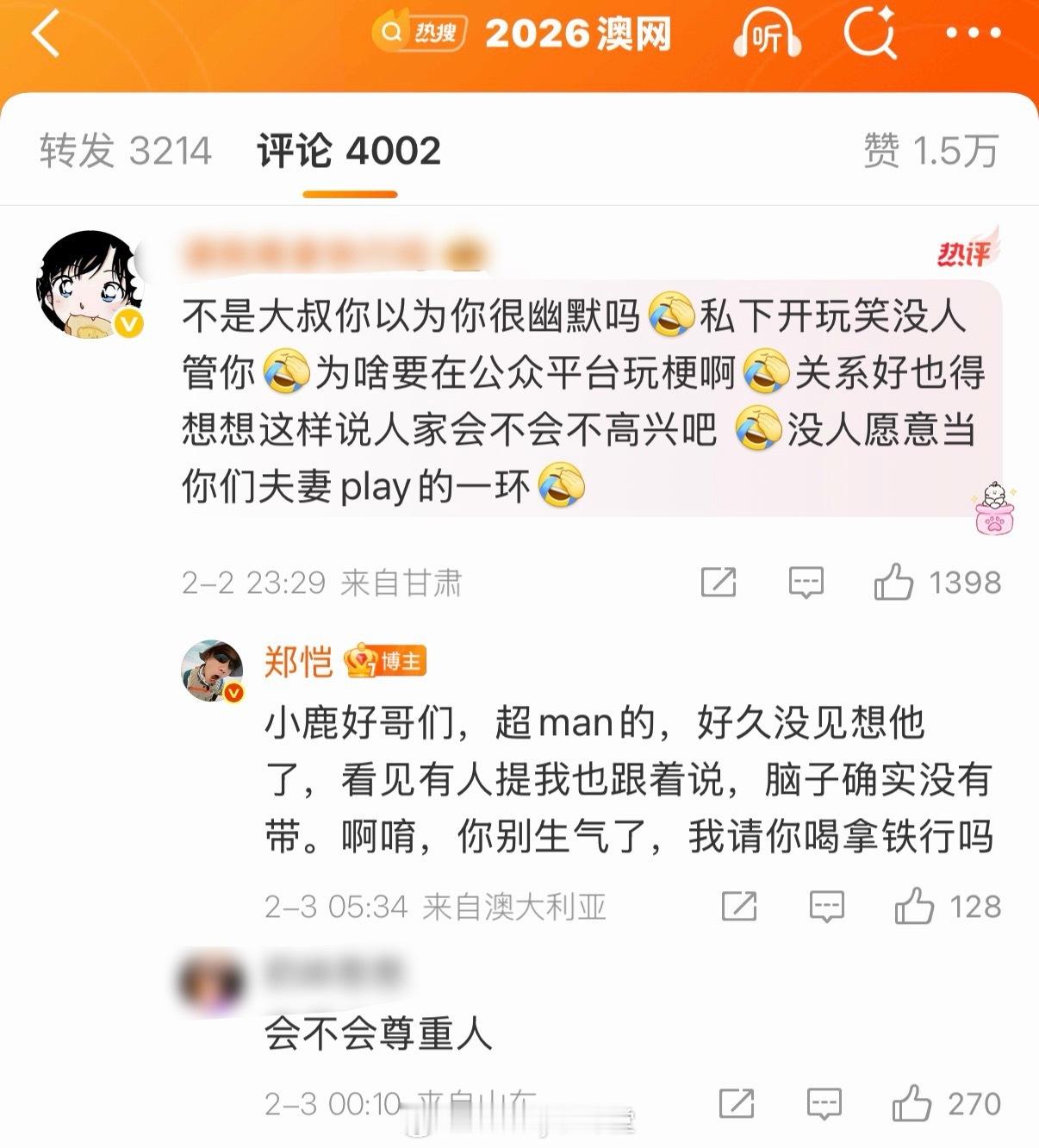 郑恺晒与苗苗的日常vlog,网友在评论区问最后的女人是谁,郑恺回复说是鹿晗……现在鹿晗粉丝很不满意,说郑恺不尊重鹿晗,之后郑恺回应鹿晗粉丝。太尴尬了