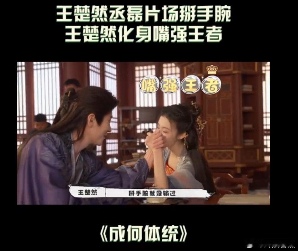 王楚然丞磊片场掰手腕 王楚然丞磊片场掰手腕也太欢乐了!楚然妥妥嘴强王者,掰手腕放狠话的样子超萌,更期待《成何体统》了王楚然说自己掰手腕没输过成何体统