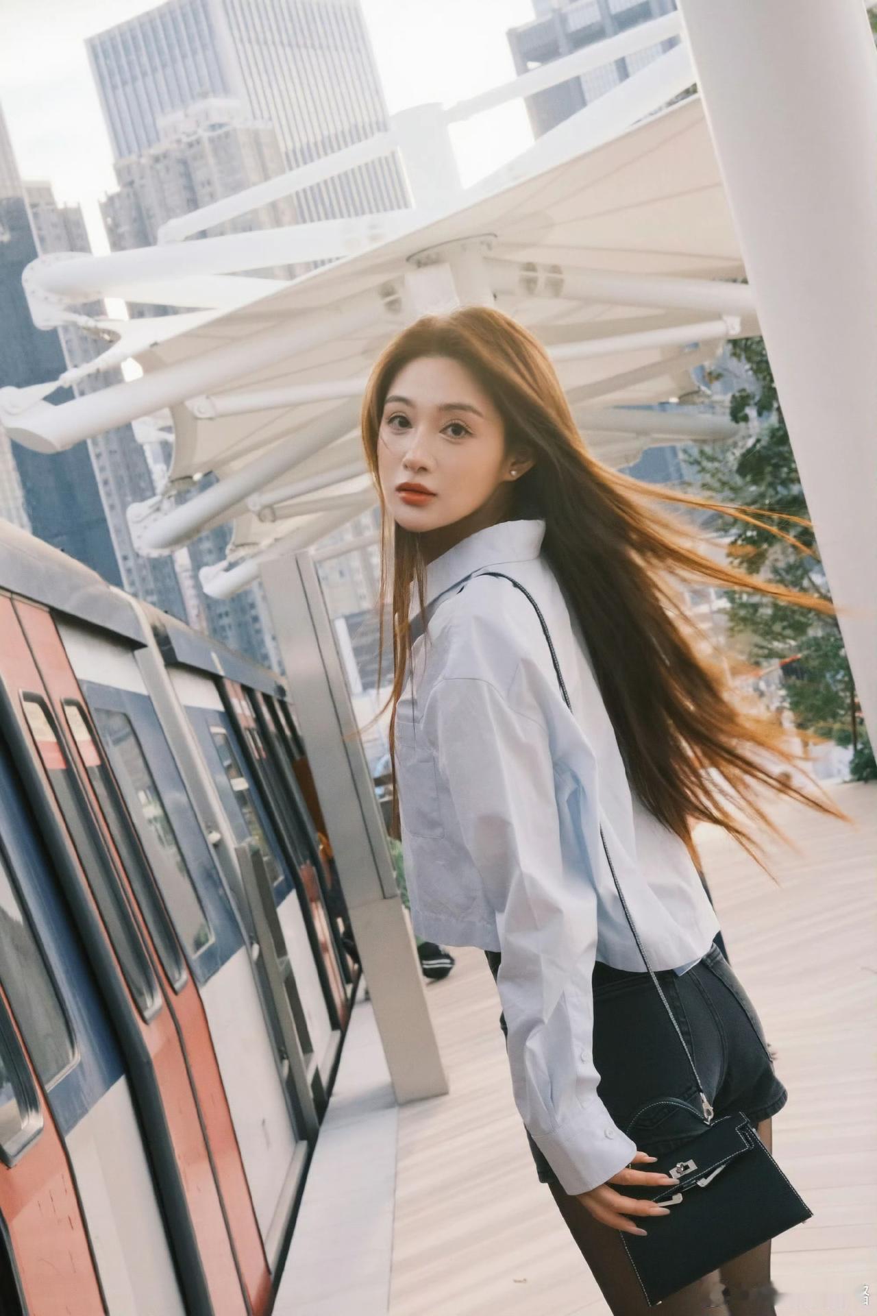 都市女孩的时尚穿搭,红蓝相间的火车背景,尽显青春活力!