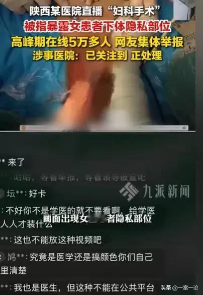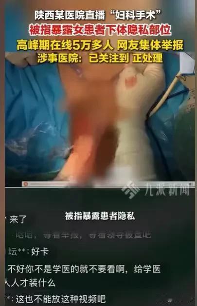 “为了钱,没有底线!”陕西咸阳,一家医院不知为了什么目的,居然直播妇科手术,直接暴露患者下面的隐私部位,最多人看时,居然超过了5万人,看到那不堪入目的画面,以及有人在上面开低俗黄 腔,网友集体举报,直播才中断,这样的直播,实在让人大惊失色。 或许很多人都没有想过,居然能够亲眼看到,医院直播的妇科手术,这样的妇科手术,如果不是这家医院直播出来,作为普通人,是根本没有机会看到的。 很多人出于好奇,纷纷进来观看,想看看妇科手术到底是怎么做的。 就是这样的好奇心,大家一涌而入,直播间最高人数时,居然达到5万多人。 就在大家好奇的观看中,突然,直播出现了让人难以置信的一幕,直播的画面,直接对着患者下体的隐私部位。 这太让人震惊了,看到这一幕,屏幕上的弹幕更是让人不舒服,有些人就趁着这个机会,居然在那里面开低俗的黄腔。 这只是一部分人,更多的网友看到这样的画面,非常不舒服,这样的画面,医生有没有尊重患者,患者知不知道,这样的画面又被他人也有用心地说低俗的言论,实在让人接受不了。 看到如此让人难以接受的画面,网友们纷纷举报,由于举报人数非常多,这样的直播终于被中断了。 虽然这样的画面出现的时间不长,但涌进直播间的人,不少人都看见了。 对于这样的直播画面,在网友们集体举报之后,在网上也掀起了轩然大波。 大家纷纷质疑,这样的直播,患者是否知情,如果患者不知情,在直播的过程中,自己的隐私部位,被展现在公众面前,这样的事情被患者知道之后,该是多么痛苦的一件事情。 本来患者生病了心情就不好,如今来做个手术,还被直播,这是一般人都不能接受的。 很多时候,医生做手术的时候,可能会让实习医生看,或者学医的学生看,这种情况下,应该也是要让患者知道的,在患者同意的情况下,这些实习医生和医学生才可以观看,作为学习的内容。 在不同意的情况下,患者可以拒绝被别人观看,如今有5万左右的人观看,如果患者不知情,这是让人非常痛苦的一件事情。 就算患者同意,如此直播画面,真的适合出现在大众的视野中吗? 作为普通人,如果没有学医的常识,观看直播,可能不能提供有价值的建议,他们观看这样的直播,其实也是看不懂的。 更何况,一般的手术画面是比较血腥的,如此血腥的画面,真的合适普通人看吗? 既然不合适普通人看,为何医院要进行妇科手术直播? 对于医院直播的目的,大家也是纷纷猜测。 有人觉得,可能是医院为了流量,为了博眼球,为了钱,所以才会通过这样的方式吸引大家的注意。 有的人觉得,可能是医院为了让大家看到他们的手术过程,在大家的监督下,证明他们在认真地对待每一个患者。 不管是什么原因,医院进行这样的直播都非常不妥。 毕竟大家都是普通人,没有学医的常识,如此画面不宜大家看,大家看了也不能提供有价值的建议,这样的直播不应该出现在大众的视野中。 更何况在这样的手术当中,不管患者知不知情,都不应该让患者下体的隐私部位,出现在直播画面里,给别有用心的人,有机可乘。 出现这样的画面,医院如此直播,肯定是不对的。 首先,医院直播患者做手术的画面,这行为已经侵犯了患者的合法权益,构成侵犯公民个人信息罪。 《刑法》第253条规定:违反国家有关规定,向他人出售或者提供公民个人信息,情节严重的,处三年以下有期徒刑或者拘役,并处或者单处罚金;情节特别严重的,处三年以上七年以下有期徒刑,并处罚金。 这是在患者同意的情况下,都有可能构成此罪。 其次,如果患者没有同意,医院直播下体这些隐私部位的行为,就有可能构成传播淫秽物品罪。 《刑法》第364条规定:传播淫秽的书刊、影片、音像、图片或者其他淫秽物品,情节严重的,处二年以下有期徒刑、拘役或者管制。 组织播放淫秽的电影、录像等音像制品的,处三年以下有期徒刑、拘役或者管制,并处罚金;情节严重的,处三年以上十年以下有期徒刑,并处罚金。 总的来说,医院不应该直播手术的画面,更不应该出现患者隐私部位的画面。 那么你对这样的直播画面有何看法呢?