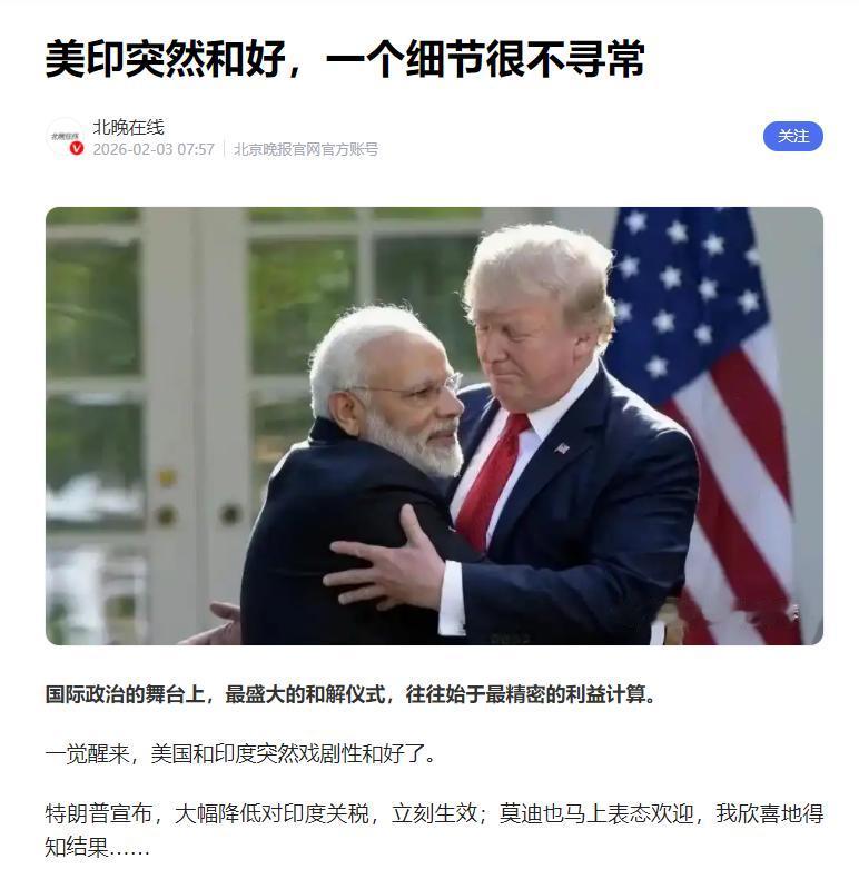 一觉醒来,美印真和好了?特朗普降关税,莫迪只笑不吭声,猫腻藏在这 据媒体2月3日报道:美国和印度最近突然就和好了,看着特别亲。美国总统特朗普先在网上发文,说要大幅降低对印度商品的关税,而且马上就生效。 紧接着,印度总理莫迪也发文,说特别欢迎这个决定,还一个劲谢特朗普。我刚看到也挺意外,这俩国家前阵子闹得挺僵,怎么突然就和好了? 可咱们看事儿不能只看表面,这里面藏着猫腻,有个细节特别反常,全世界都在盯着。 其实他俩能这么快和好,根本不是因为朋友情分,全是为了自己的好处。最关键的猫腻,跟俄罗斯有关。 特朗普发文时特意说,莫迪答应了,以后印度不再买俄罗斯的石油,改成多买美国和委内瑞拉的石油,还说这是俩人商量好的。 可大家看莫迪的发文,只说欢迎美国降关税,感谢特朗普,压根没提“不买俄罗斯石油”这事儿,跟没听见一样。这绝不是忘了,是故意不提。 特朗普为啥主动降关税?去年加关税,就是因为印度一直买俄罗斯的石油,美国不高兴。 美国想拉着印度疏远俄罗斯,还想把自己的石油、农产品卖到印度,印度人多,能赚不少钱,还能削弱俄罗斯的影响力,一举两得,对特朗普自己的政治前途也有好处。 莫迪为啥欢迎降关税?因为之前50%的关税,让印度很多企业亏了不少钱,现在关税降下来,印度的东西能顺利卖到美国,能多赚钱,这种实实在在的好处,莫迪肯定不会拒绝。 可他为啥不提不买俄罗斯石油?因为他根本没打算停。俄罗斯的石油比美国的便宜很多,印度每年要进口大量石油,买俄罗斯的能省不少钱,而且印度不想得罪俄罗斯,俄罗斯也是印度的重要合作伙伴,能帮印度不少忙。 另外,印度以前买俄罗斯的石油,最多时占了总进口量的40%,现在虽降到25%,但俄罗斯还是重要的石油来源,真停买了,印度不仅要多花钱,还可能缺石油,吃亏的是自己。 所以莫迪的心思很简单:先收下降关税的好处,不买俄罗斯石油这事儿,先拖着,既不得罪美国,也不放弃便宜石油,两边都不得罪,多为印度谋好处。 特朗普说印度答应了,要么是想吹自己外交厉害,要么就是被莫迪敷衍了。 说到底,国与国之间,没有永远的朋友,只有永远的好处。特朗普和莫迪喊好朋友,就是演给全世界看的,都是为了自己的利益。 这次美印和好,看着热闹,实则全是猫腻,等以后利益谈不拢,俩人大概率还会翻脸。
