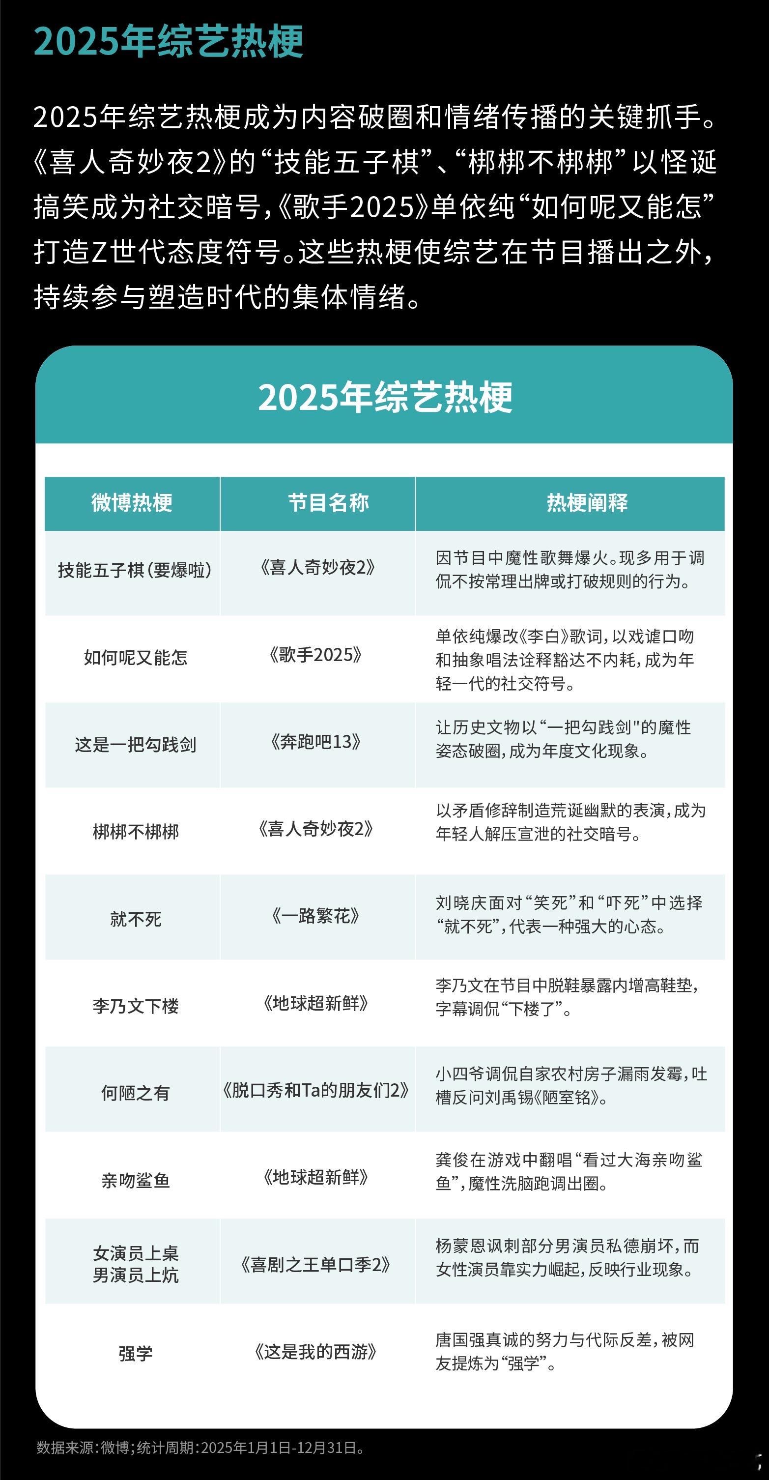 2025综艺热梗夯爆了2025微博综艺热梗 《喜人奇妙夜2》的技能五子棋、梆梆不梆梆;《歌手2025》的如何呢又能怎;《奔跑吧13》的这是一把勾践剑;《一路繁花》的就不死;《地球超新鲜》的李乃文下楼、亲吻鲨鱼;《脱口秀和Ta的朋友们2》的何陋之有;《喜剧之王单口季2》的女演员上桌男演员上炕;《这是我的西游》的强学……哪个梗最能代表你的精神状态? 微博娱乐白皮书