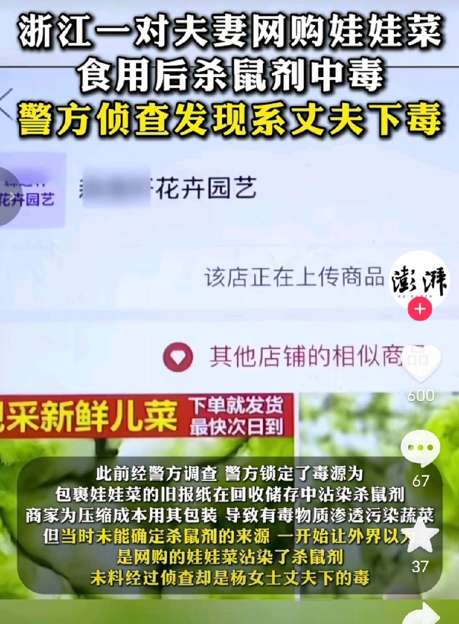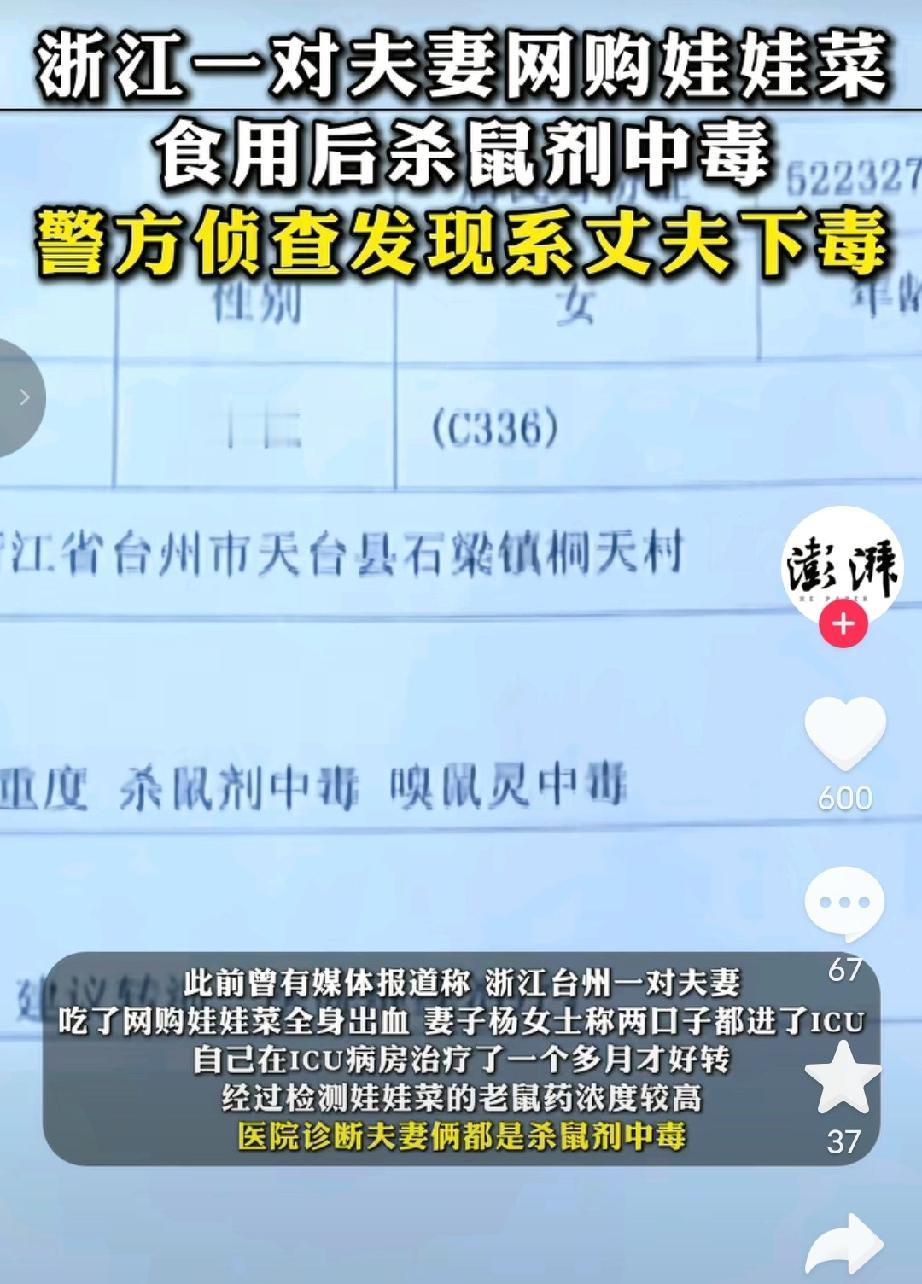 狠人呐!这反转也太大了吧!此前浙江台州一对夫妻网购娃娃菜中毒事件,警方发现竟然是丈夫下毒! 2025年12月,浙江台州的杨女士花费电商平台网购8斤娃娃菜,12月16日到货当天,夫妇俩清水煮食,结果次日便双双突发身体不适,进了ICU,一个月后才好转。 此前警方调查是包装娃娃菜的旧报纸沾染杀鼠剂,商家为节省成本用其包装,导致有毒物质渗透到污染蔬菜,但未确定杀鼠剂的来源。 所以,一开始外界都以为是网购的娃娃菜沾染了杀鼠剂。 因此,商家也遭到谴责,涉事店铺下架失联,账号也注销了。 谁料2月3日据媒体报道,案件迎来惊天反转,警方深入侦查后查明,是杨女士的丈夫下的毒! 目前杨女士的丈夫已被警方采取刑事强制措施,案件仍在进一步调查中。 看到这则消息我真的是被“毒”到了,想想都害怕! 想想看,这得是多大的仇、多深的心机,才能让一个人做出“杀敌一千,自损八百”的疯狂举动?为了陷害妻子,竟然不惜把自己的性命也搭进去,甚至双双住进ICU,这种狠辣和算计,剧本都不敢这么写呀!这还是枕边人吗? 这一结局,虽然还了商家一个清白,却也让人感到深深的无力。那个倒霉的商家,无端端被网暴、被唾弃,店铺倒闭、账号注销,生意算是彻底毁了。虽然真相大白,但这几个月来的委屈和损失,又该谁来赔? 咱们常说,防人之心不可无,但大多数时候,咱们防的是骗子、是小偷、是坏人,谁能想到回到家,还要防着那个曾经许诺要共度一生的伴侣? 买菜怕有农药残留,走路怕遇到意外,咱们总以为只要小心点就能避开风险。可像杨女士这样,风险竟然来自同吃一锅饭的丈夫,真是正防不胜防啊! 说到底,婚姻这场修行,选对人真的比什么都重要。如果缘分尽了,真的可以一别两宽,何必非要走上一条不归路? 如今丈夫被刑拘,等待他的将是法律的严惩,而杨女士虽然捡回一条命,但心里的这道坎,恐怕这辈子都难跨过去了。
