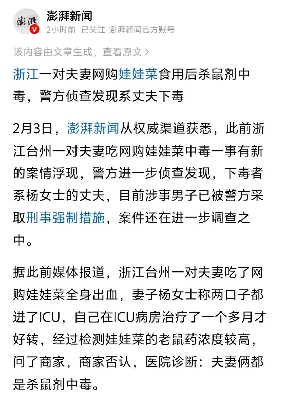 浙江一对夫妻网购娃娃菜食用后杀鼠剂中毒。警方侦查,原来是丈夫下的毒,那夫妻俩都进了重症监护室。妻子在病房里待了一个多月,幸好俩人都有钱。 不明白了,为什么他下毒自己也吃了?难道想同归于尽吗?因为什么事情会对自己的妻子下毒?这样说卖家是被冤枉的。之前还在网上听说下毒的都是身边的人,原来这话不假。