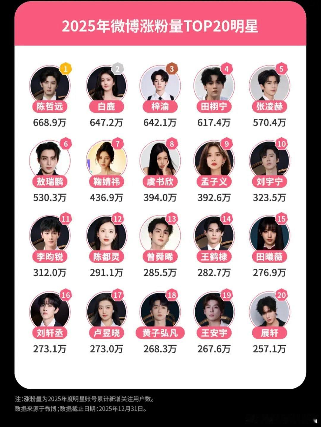 2025微博涨粉量前三明星是:陈哲远、白鹿和紫玉。