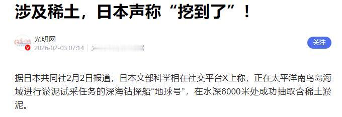 日本政府宣布! 2月2日,日本官房副长官尾崎正直在记者会上宣布:日本海洋研究开发机构(JAMSTEC)的钻探船“地球号”已成功从南鸟岛外海的深海海底,采集到含大量稀土的黏土状沉积物,是非常让人高兴的事,这将为日本国产稀土产业化迈出一步! 日本早在2012年就发现这小岛周边的深海里有稀土,2013年又确认这里的稀土浓度不低,估算下来总储量至少有1600万吨。 要是真能全部开采,够全球用好几百年,而且里面还都是镝、钕这种高价值的稀土。 这次采集的地点在6000米深的海底,差不多相当于6座珠穆朗玛峰叠起来,海底水压有五六百个大气压,设备稍微出一点毛病,整个试采就全白费了。 这次能成功挖到,说实话,日本在深海探测这块,确实有点技术本事。 但挖到含稀土的黏土,跟能自己生产稀土、摆脱进口依赖,还差着十万八千里呢,后面的难关,多到你想象不到。 稀土提炼本身就是个技术活,17种稀土元素混在一起,要一个个分离开,得经过200多个步骤,咱们中国现在能通过一套特殊工艺精准分离,纯度还能达到5N到6N级。 可日本现在连重稀土精炼的纯度都达不到,顶多4N级,差得不是一点半点。 深海开采的成本比陆地高10倍还多,有测算说,光是开采稀土泥,就得16年才能收回设备投资。 而且现在日本提取1公斤稀土的成本,是市场价的150到200倍,完全没竞争力。 深海的生态环境特别脆弱,咱们人类对深海的了解,还不如对月球的了解多,大规模开采很可能会破坏海底的生态平衡,而且这种破坏是不可逆的。 根据《联合国海洋法公约》,深海区域是全人类的共同财产,不是日本想挖就能挖的,开采前必须做好环境评估,而要评估深海开采的长期生态影响,至少需要几十年时间。 现在国际社会对环保的要求越来越高,日本这事儿,肯定会遭到不少国家和环保组织的质疑和反对。 就算日本运气好,把开采和提炼技术都搞定了,也很难形成完整的产业链。 现在全球91%的稀土精炼产能都在咱们中国手里,咱们也是全世界唯一一个拥有完整稀土产业链的国家,从开采、提炼,到加工成工业上能用的产品,咱们一套流程都能搞定。 日本就算有了稀土原料,大概率还得依赖咱们的技术和设备,才能把稀土加工成造汽车、造军工装备能用的东西。 这次日本挖到的,不是咱们平时听说的那种固体稀土矿,而是黏土状的沉积物,跟陆地上的稀土矿完全不一样。 这种深海黏土里的稀土,是海底的磷堆积多了,再加上海底水流的侵蚀、分选,慢慢形成的富稀土层,所以开采和提炼的方式,也跟陆地完全不同,难度也更大。 不过也有个小优势,这种深海稀土泥里的放射性元素含量比较低,后续分离的时候,环保风险能小一点。 但这点小优势,跟技术和成本上的短板比起来,根本不值一提,起不到任何作用。 所以总的来说,日本这次确实是取得了一个小小的技术突破,挖到了含稀土的黏土,他们开心也能理解。 但短期之内,日本根本不可能摆脱对中国稀土的依赖,所谓的“国产稀土产业化”,还差得老远,中间还有一大堆不确定的事儿。 对咱们来说,也不用过分担心,只要继续巩固咱们在稀土产业链上的优势,把提炼技术、回收技术做得更好,就不用担心被其他国家轻易超越。