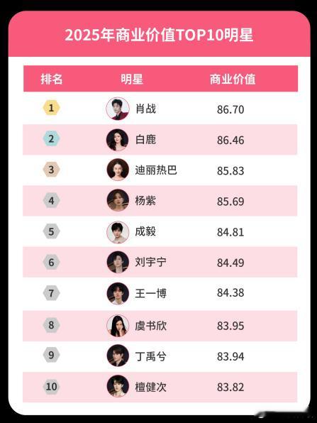 2025年商业价值TOP10明星肖战、白鹿、迪丽热巴、杨紫、成毅、刘宇宁、王一博、虞书欣、丁禹兮、檀健次