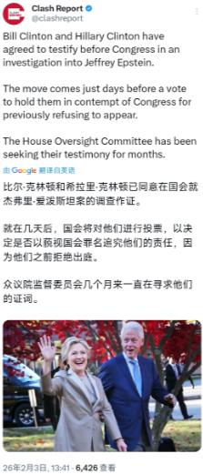 外媒2月3日报道:“比尔·克林顿和希拉里·克林顿已同意在国会就杰弗里·爱泼斯坦案的调查作证。就在几天后,国会将对他们进行投票,以决定是否以藐视国会罪名追究他们的责任,因为他们之前拒绝出庭。众议院监督委员会几个月来一直在寻求他们的证词。” 说起来,克林顿这口碑真是一如既往的“稳”,这么多年,但凡沾上个不光彩的事,总能找到他的影子,真应了那句话:档案十二卷,卷卷有顿名。 先说说这爱泼斯坦案是啥来头。爱泼斯坦是个美国富商,可干的全是性侵未成年人的龌龊事,2019年被捕后没多久就死在狱里了,官方说是自杀,可一直有人质疑。 后来这案子越查越大,法院陆续解封了200多份文件,一下子曝光了近200个和他有牵连的权贵,克林顿夫妇的名字赫然在列,这才把他俩推到了风口浪尖。 美国司法部1月底刚公布了一批文件,足足300多万页,还有几千个视频、十几万张图片,把克林顿和爱泼斯坦的关系扒得明明白白。 最实在的证据就是飞行记录,爱泼斯坦有架私人飞机,被人叫做“洛丽塔航班”,从2001年到2004年,克林顿和他的团队至少坐了16次这架飞机,去了非洲、欧洲不少地方。 可克林顿之前还嘴硬,说自己只坐过4次,而且是为了慈善活动,现在证据摆出来,这话根本站不住脚。 文件里还有更直白的东西,有一张照片是克林顿赤裸上身,和一个被司法部认定为“爱泼斯坦性侵受害者”的人在按摩浴缸里的合影,这可不是随便能狡辩的。 另外,爱泼斯坦的长期合伙人麦克斯韦,就是那个已经因为招募未成年人供爱泼斯坦性侵,被判20年监禁的女人,她和克林顿团队的人来往特别频繁,光电子邮件就发了不少。 有封2003年的邮件里,麦克斯韦还问克林顿的工作人员,要不要邀请克林顿来参加晚宴;2001年的时候,克林顿的工作人员还通过麦克斯韦,要英国安德鲁王子的电话,想安排高尔夫球活动,可见他们的关系有多熟。 其实克林顿的烂事早就不是新鲜事了,早在上世纪90年代,他还在当阿肯色州州长的时候,就被一个叫宝拉・琼斯的女职员指控性骚扰,后来这事闹到法庭,克林顿赔了85万美元才私下和解,可他自始至终都没承认自己有错。 后来他当总统期间,又和白宫实习生莱温斯基闹出不正当关系,这事被曝光后,克林顿一开始还撒谎否认,直到证据确凿,才公开道歉,最后还被众议院启动了弹劾调查,虽然参议院没通过弹劾,但名声早就臭了。 除此之外,还有歌手说和他有12年的婚外情,拿出了录音带;有白宫志愿者指控他在椭圆形办公室强行亲吻抚摸自己;还有前护士说他当州长的时候强奸过自己,这些事一件接一件,从来就没断过。 这次国会要调查爱泼斯坦案,自然绕不开克林顿夫妇。2025年11月,美国国会两院全票通过了《爱泼斯坦档案透明法案》,要求司法部把所有相关文件都公开,之后众议院监督委员会就开始找克林顿夫妇要证词。 2026年1月,委员会正式发了传票,可克林顿夫妇直接拒绝了,说这张传票“在法律上无效”,还声称已经把自己知道的所有信息都提供了。 可委员会根本不买账,1月21日就投票通过了推进指控他俩藐视国会的决议,这可是司法部可能起诉他们的第一步。 更有意思的是,不光是共和党人支持这事,委员会里近一半的民主党成员也投了赞成票,说这是为了维护国会传票的权威,连前众议院议长佩洛西这样的民主党高层出来反对都没用。 按照流程,接下来就是众议院全体会议投票,最早就在2月第一周,要是投票通过了,就相当于正式谴责了克林顿夫妇,还可能把案子移交给司法部,到时候他俩可能面临起诉,这才逼着他们同意出庭作证。 现在克林顿夫妇虽然松口了,但大家都清楚,他们之前一直躲着不愿出来,肯定是心里有鬼。毕竟爱泼斯坦当年还去过17次白宫,都是在克林顿当总统的时候,他俩之间的联系远不止坐几次飞机那么简单。 这次国会让他们作证,就是想搞清楚,克林顿到底知道爱泼斯坦的哪些犯罪行为,有没有参与其中,或者有没有帮忙掩盖。 这么多年来,克林顿每次出丑闻,都想着用各种办法推脱、撒谎,可每次都被证据打脸。这次爱泼斯坦案的证据越来越多,国会调查也越来越严,就算他现在同意作证,想蒙混过关恐怕也没那么容易。 毕竟文件里的飞行记录、照片、电子邮件都摆得明明白白,还有那么多过往的丑闻打底,他的口碑早就烂透了。 说来说去,克林顿的名声之所以这么差,就是因为他自己屁股不干净,这么多年下来,每次涉及这类不光彩的事,总能找到他的名字。 这次国会投票在即,他就算同意作证,能不能过这一关还不好说,但大家心里都清楚,“档案十二卷,卷卷有顿名”可不是白说的,他的这些烂事,恐怕这辈子都洗不清了。 接下来就看国会的调查能挖出多少真相,克林顿夫妇到底能不能给公众一个交代,不过按照他以往的作风,这事大概率还得折腾一阵子。