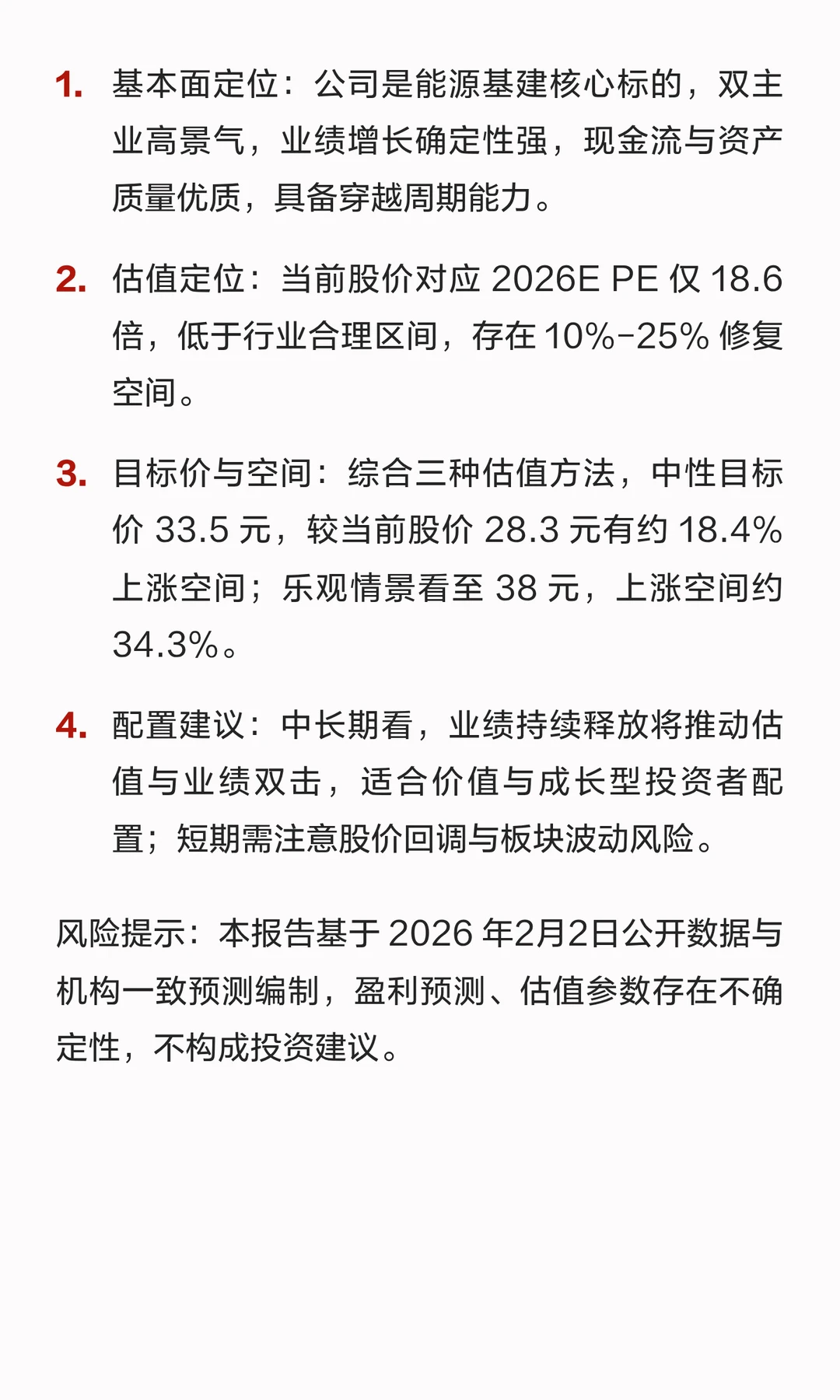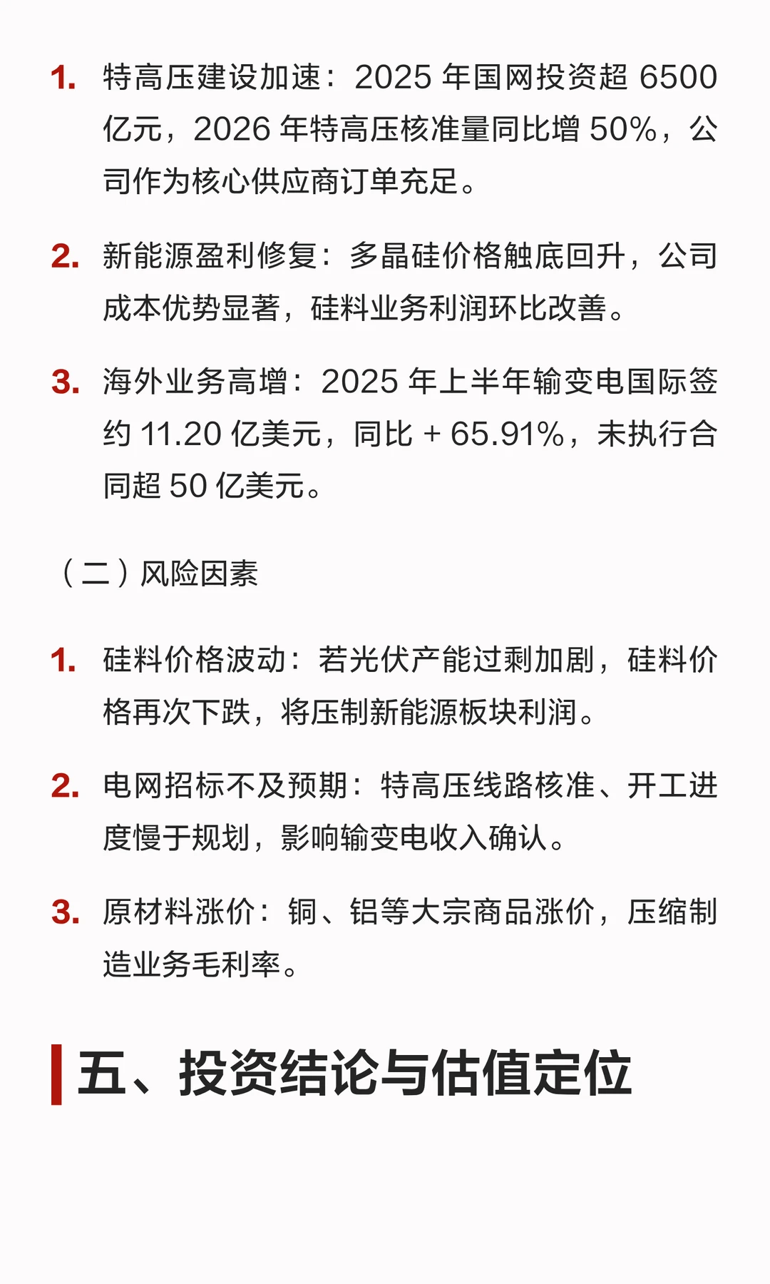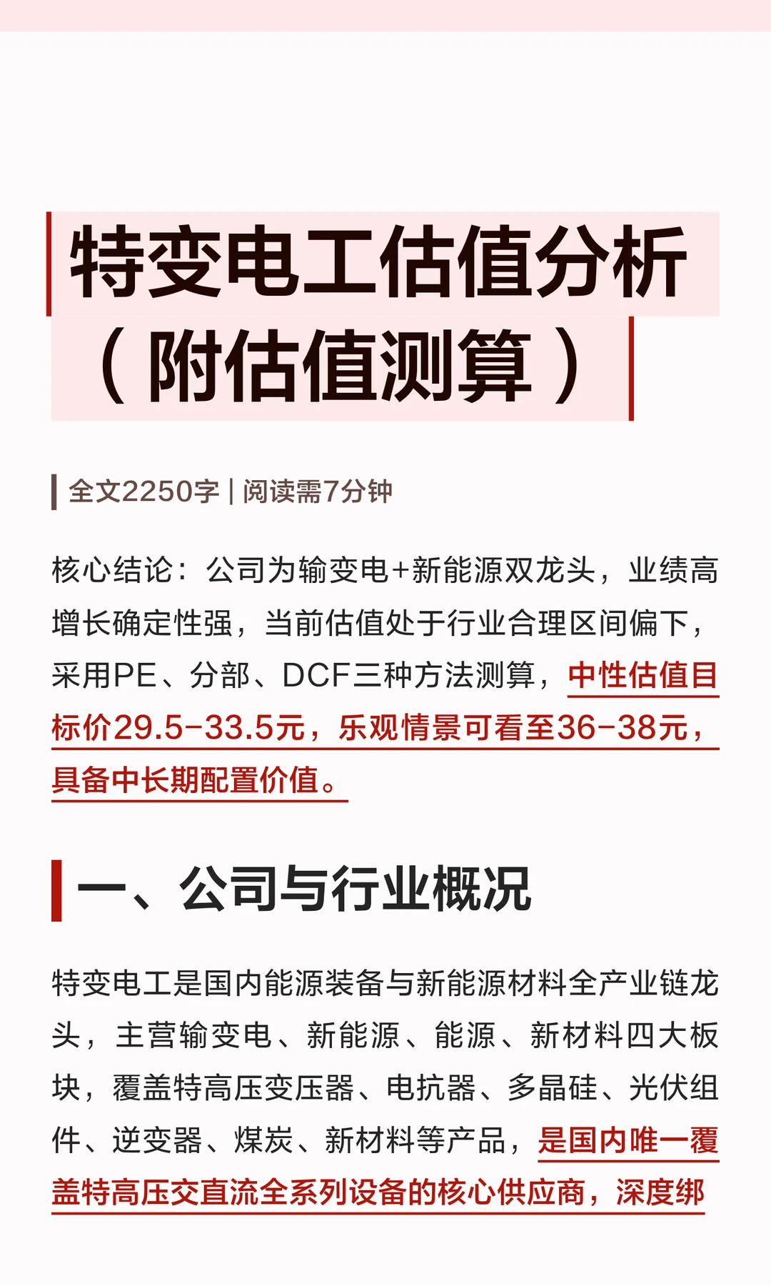 核心结论:公司为输变电+新能源双龙头,业绩高增长确定性强,当前估值处于行业合理区间偏下,采用PE、分部、DCF三种方法测算,中性估值目标价29.5-33.5元,乐观情景可看至36-38元,具备中长期配置价值。
