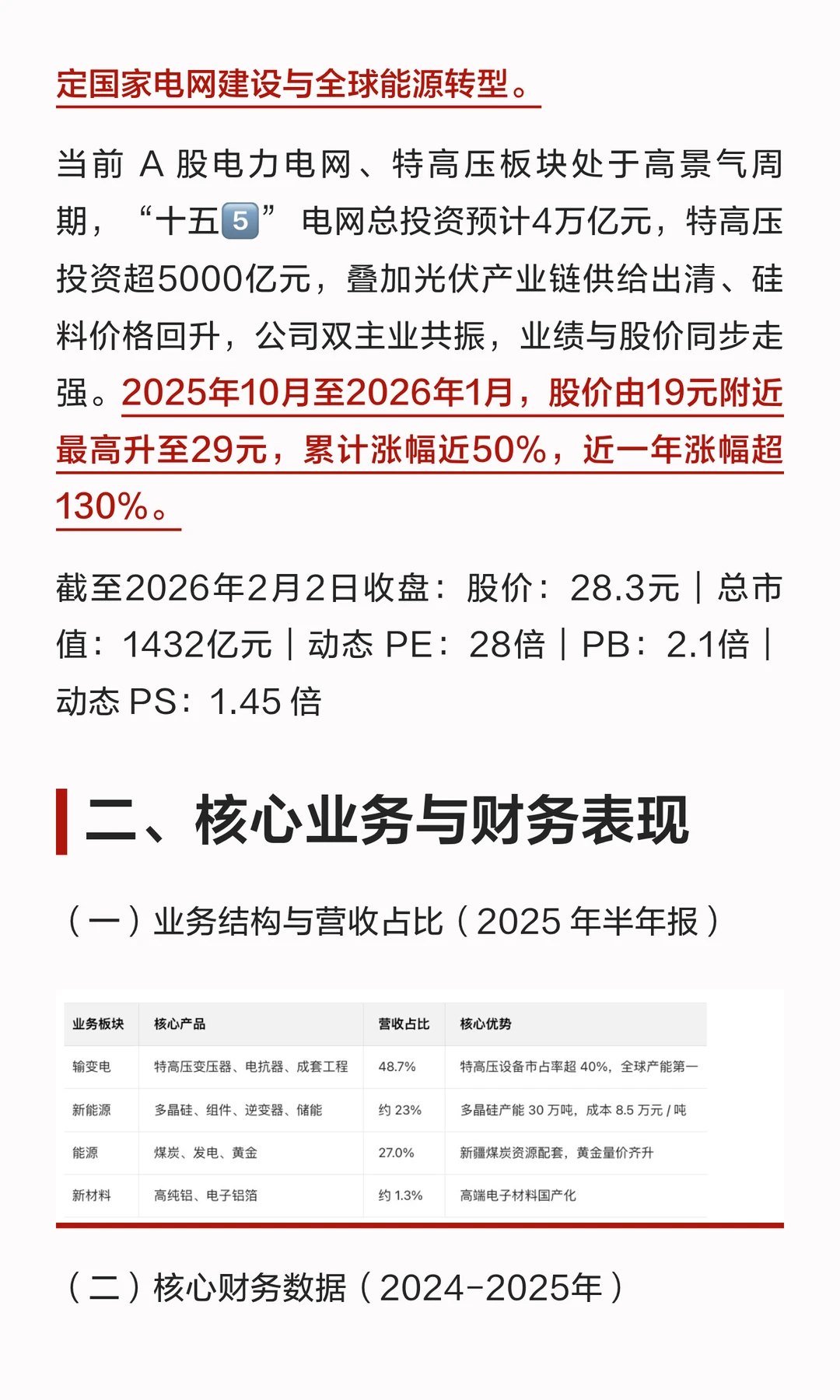 当前 A 股电力电网、特高压板块处于高景气周期,“十五5️⃣” 电网总投资预计4万亿元,特高压投资超5000亿元,叠加光伏产业链供给出清、硅料价格回升,公司双主业共振,业绩与股价同步走强。2025年10月至2026年1月,股价由19元附近最高升至29元,累计涨幅近50%,近一年涨幅超130%。