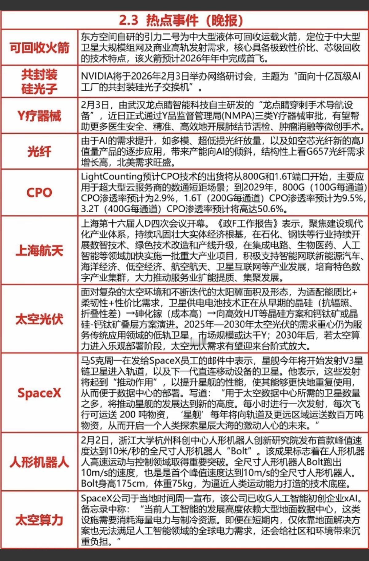 2.3周二晚间 财经热点事件 汇总! 1.可回收火箭 2.共封装硅光子 3.光纤、CPO 4.上海航天 5.太空光伏 6.太空算力,人形机器人