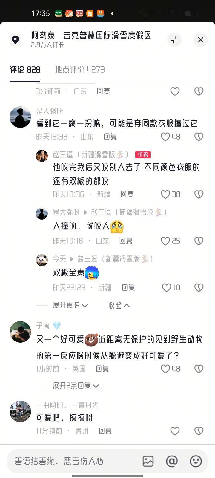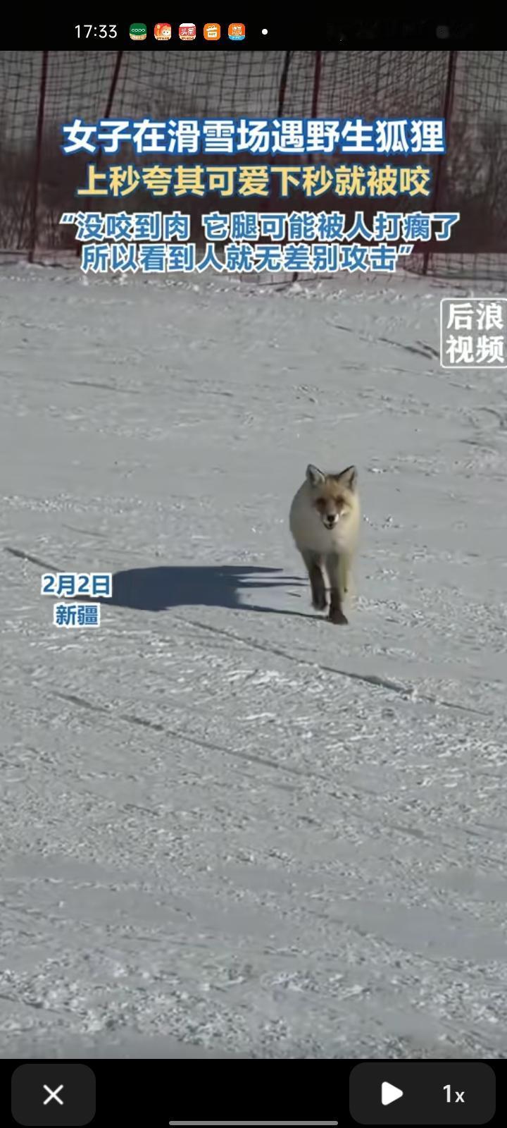 2月2日,阿勒泰地区布尔津县。一女生在滑雪场偶遇野生狐狸,上一秒夸它可爱,下一秒就被咬,幸好没咬到肉。 当事人称,它的腿可能被人打瘸了,看到人就无差别攻击,咬完自己之后又去咬别人了