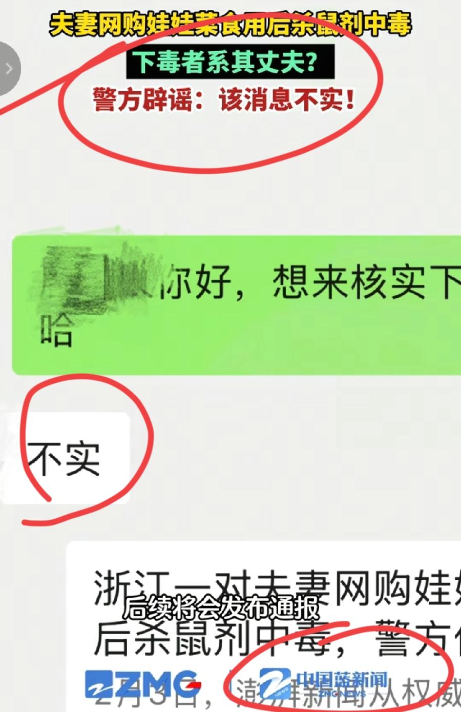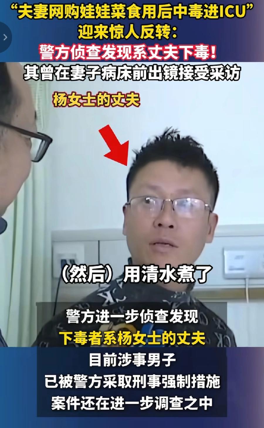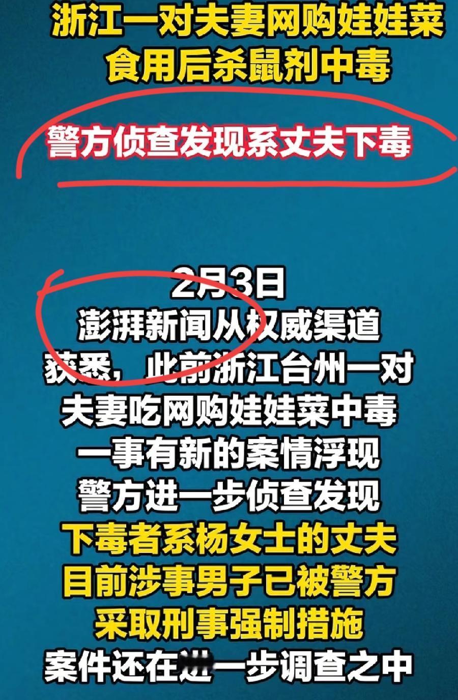 夫妻娃娃菜,到底是不是丈夫陈某投毒?澎湃新闻第一个报道,反转了,现在中国蓝新闻又说,消息不实,又反转了!到底哪个对?相信澎湃新闻的权威性! 推翻原来娃娃菜外包装有老鼠药的结论,如果没有权威信息,不会突然说丈夫被采取刑事强制措施,又说投毒,还有上一次贺蛟龙去世新闻,最后也证明是澎湃新闻是对的!而且再看陈某在医院,眼神闪躲、说话吞吞吐吐,很心虚! 再看中国蓝新闻的反转,仅仅是通过微信,向其中一位疑似民警求证,对方仅回复两个字,不实,很可能是具体某一些细节,不是没否定这个新说法,到底真假如何,看后续!