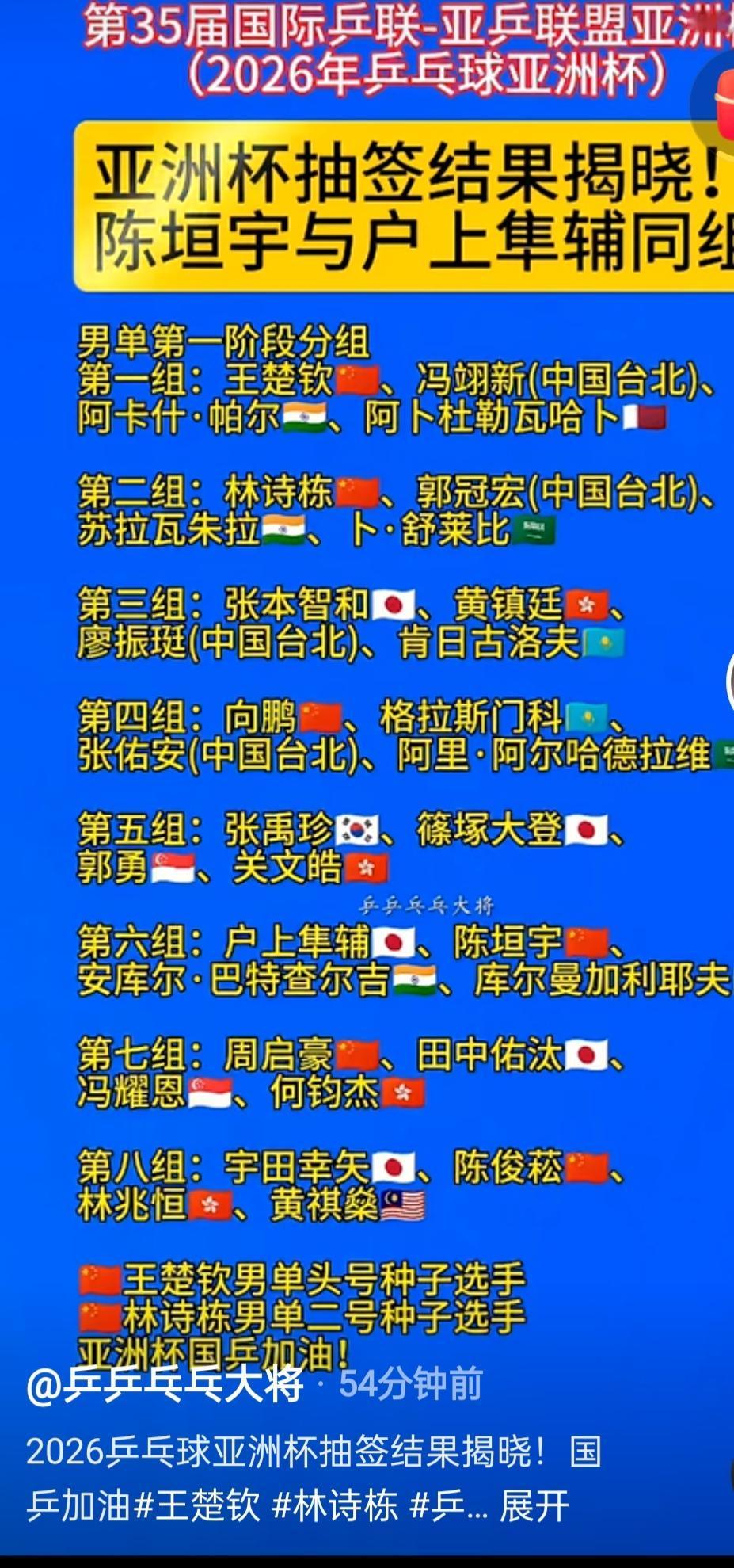 乒球亚洲杯分组,预测进入8强的男单名额! 笫一组,王楚钦胜! 第二组,林诗栋胜! 第三组,张本智和胜! 第四组,向鹏胜! 第五组,张禹珍胜! 第六组,户上隼辅胜! 第七组,周启豪胜! 第八组,陈俊崧胜! 循环赛结束后,各组前二进入16强,再是1/8决赛,1/4决赛,半决赛,冠亚军赛