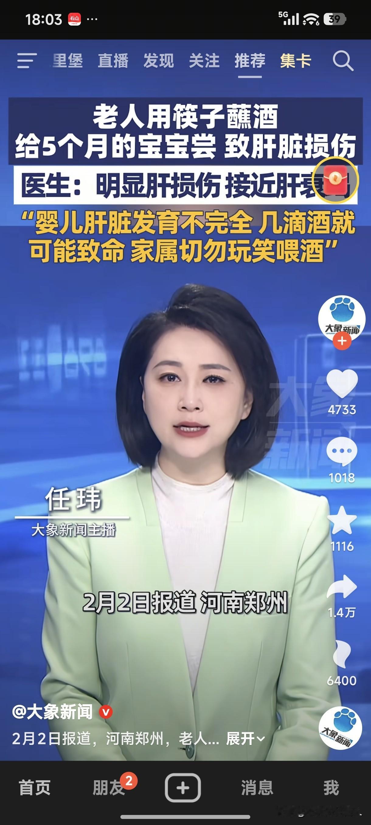 这是真的吗?太可怕了! 2月2日,河南郑州。老人用筷子蘸酒给5个月的宝宝尝,致肝脏损伤。 医生:明显肝损伤,接近肝衰竭! 婴儿肝脏发育不完全,几滴酒就可能致命,家属切勿玩笑喂酒。 在老家跟亲戚朋友聚餐时,老人喜欢孩子,总是用筷子蘸酒喂酒吃。万幸的是啥事儿没发生,以后还真的不能那样做了,会害了孩子啊!