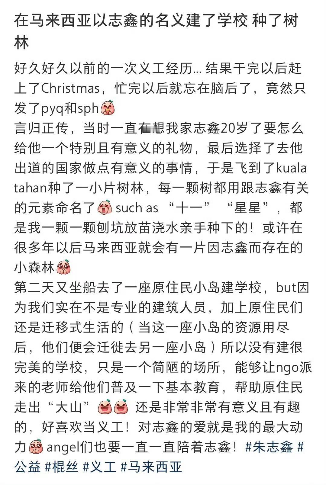 朱志鑫粉丝飞马来西亚做公益 有朱志鑫粉丝专门飞马来西亚做公益,以朱志鑫的名义建学校,种树林,非常正能量