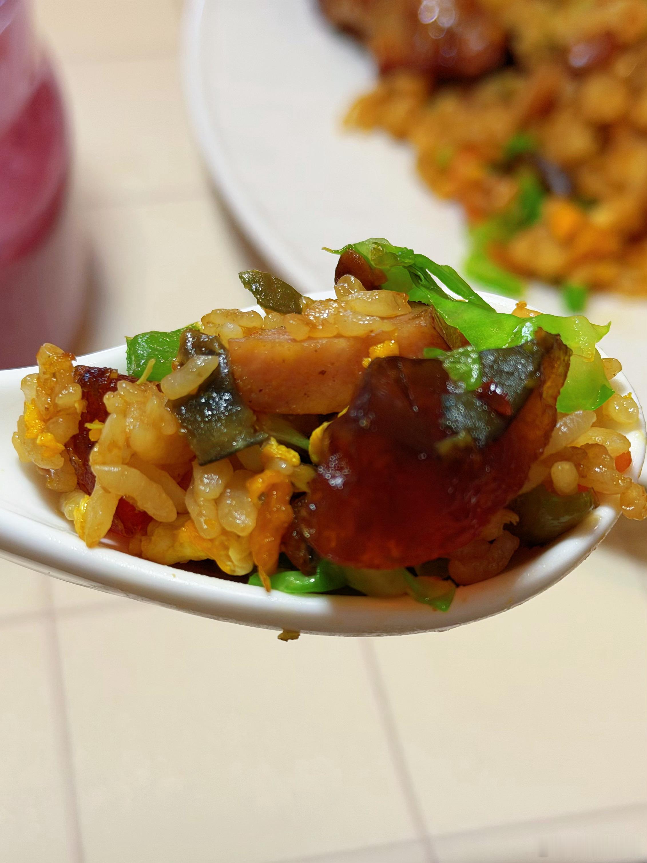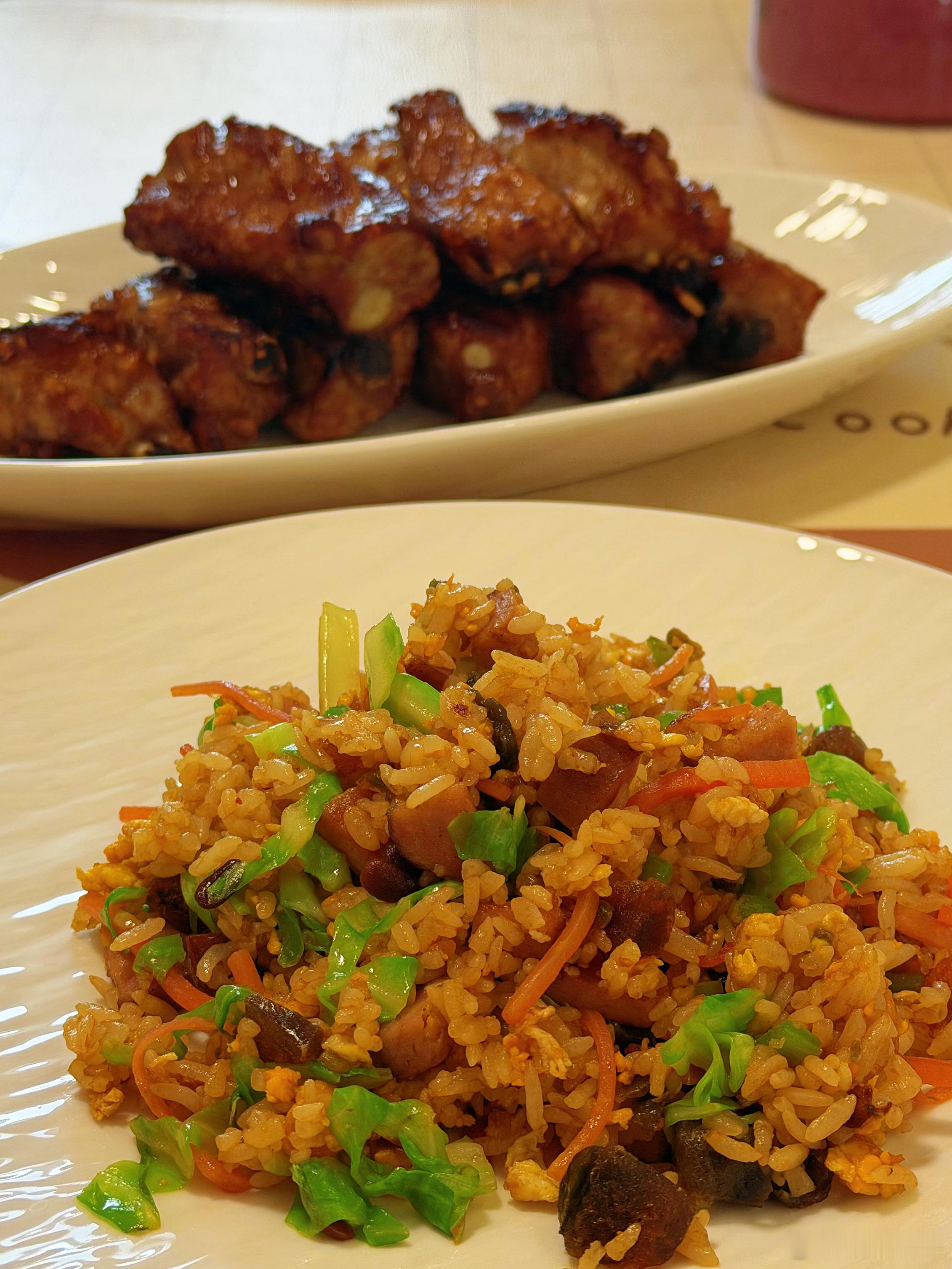 今晚尝试做了一个皮蛋炒饭,烤了点排骨