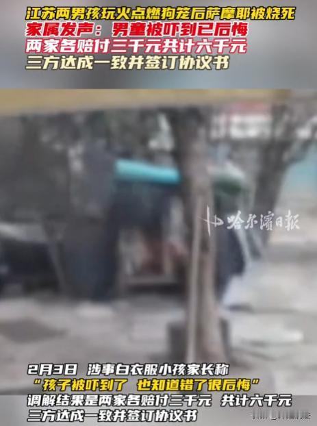 江苏,有只萨摩耶在笼子里,被俩小孩用烟花点着了,涉事的是穿黑衣和白衣的两个小男孩,点火的是黑衣男孩,白衣男孩和他一起玩,火燃起来后大叫起火了,后来家长发声,说孩子吓坏了,并非有意伤害的狗,已赔礼道歉并打算赔偿,可和狗主人没协商好。 这个事情,有了新的进展,涉事的是两个小孩子,一个穿黑衣服,一个穿白衣服。 点火的是穿黑衣服的男孩子,白衣服的男孩子和他一起玩,火起来后,小男孩惊慌失措大叫起火了。 后来他的家长出来发声,说小孩子吓坏了,并非有意害萨摩耶,可偏偏出了这样的事。 家长对孩子进行了严厉批评,也不知该如何面对大家,只能说事情已经发生,必须承担责任,先向狗主人赔礼道歉,再给予赔偿,家长也确实这么做了。 可此事和狗主人并未协商好,其中还有不少曲折。 因为当天狗主人不在家,是狗主人的外公前去处理的。 当时黑衣男孩和白衣男孩的家长一同去了派出所,起初想赔给狗主人一条狗以示诚意,对方想要多贵的就赔多贵的。 可外公知道,这是孙女养了七年的狗,不是另一条狗能替代的,便没有同意。 后来两位家长也知道自家孩子做得过分,若不妥善解决,肯定会引起公愤。 于是提出一人赔1000元,合计2000元,希望能得到狗的主人谅解,了结此事。 可外公还是不同意,这只狗虽是孙女养的,却也和自己十分亲近,平时都是自己喂、自己带。 之后白衣男孩和黑衣男孩的家长又退了一步,心想2000元不行,就赔6000元,一人出3000元。 狗主人的外公依旧没有同意,他觉得自己虽年纪大,但为狗讨要说法,绝不会软弱。 到最后两位家长表示,若此事还协商不成,便不再协商,让对方看着办。 外公心想,大家都是一个小区的,抬头不见低头见,对方赔6000元也算有诚意,便不再追究。 于是在众人的见证下签了字,认可了这个解决方案。 但真正的狗主人,也就是这名女子,对此事毫不知情。 当时她还在外地,得知狗亡的消息后悲愤不已,立刻从外地赶了回来。 她不想就这么了结此事,看着狗被烧的惨状,她不知哭晕了多少次。 在得知外公以6000元了结此事后,她坚决不同意。 这个结果让两位孩子的家长始料未及,本以为签了字,事情就结束了。 可女子称自己才是真正的狗主人是狗的实际监护人,只有自己才有决定权,而非外公。 这份协议可以撤销,她坚决不同意用钱了结此事。 白衣男孩的家长也十分委屈,称确实是自己监管不到位,孩子犯了错,可如今唯一的办法只有赔钱。 自己也按要求做了,还和孩子外公签了协议,没想到事情还是无法解决。 他写了道歉信发布出去,引来了众多网友的围观。 可不知为何,第二天这封道歉信就被删除了,具体原因不得而知,如今有人联系他,也始终没有回复。 而黑衣男孩的家长,截至目前仍无任何动静。 不过也有网友指责女子,为何不将狗养在家里,反而放在公共场所,即便用笼子关着,可放置的地方还堆放了不少杂物。 但从视频中能清晰看到,黑衣男孩先是用烟花去点羽毛,之后又用烟花点了萨摩耶的狗毛。 也有网友客观表示,勿以善小而不为,勿以恶小而为之,不管是否堆放杂物,不管养狗是否规范,都不能成为伤狗的理由。 那么,从法律角度来说,这两个还不到十岁的小孩子,最大限度能受到怎样的处罚?他们的家长又需要承担哪些责任呢? 《民法典》第一千一百八十八条:无民事行为能力人、限制民事行为能力人造成他人损害的,由监护人承担侵权责任。监护人尽到监护职责的,可以减轻其侵权责任。 两名孩子未满十岁,属于无限制民事行为能力人,其行为造成狗被烧的,由家长承担全部侵权赔偿责任,需赔偿狗主人的实际损失及精神损害抚慰金。 《预防未成年人犯罪法》第三十三条:未成年学生有故意损毁公私财物等行为,情节轻微的,由学校采取相应的管理教育措施。 孩子故意损毁他人财物(狗属个人财产),因情节较轻且未满十岁,无需承担行政或刑事责任,由家长及学校进行批评教育、严加管教。 《民法典》第一百七十一条:行为人没有代理权、超越代理权实施的民事法律行为,未经被代理人追认的,对被代理人不发生效力。 狗主人外公无代理权签订赔偿协议,狗主人明确拒绝追认,该协议自始无效,狗主人可依法重新主张合法赔偿权利。 对于此事,大家如何看待?素材来源于红星新闻!