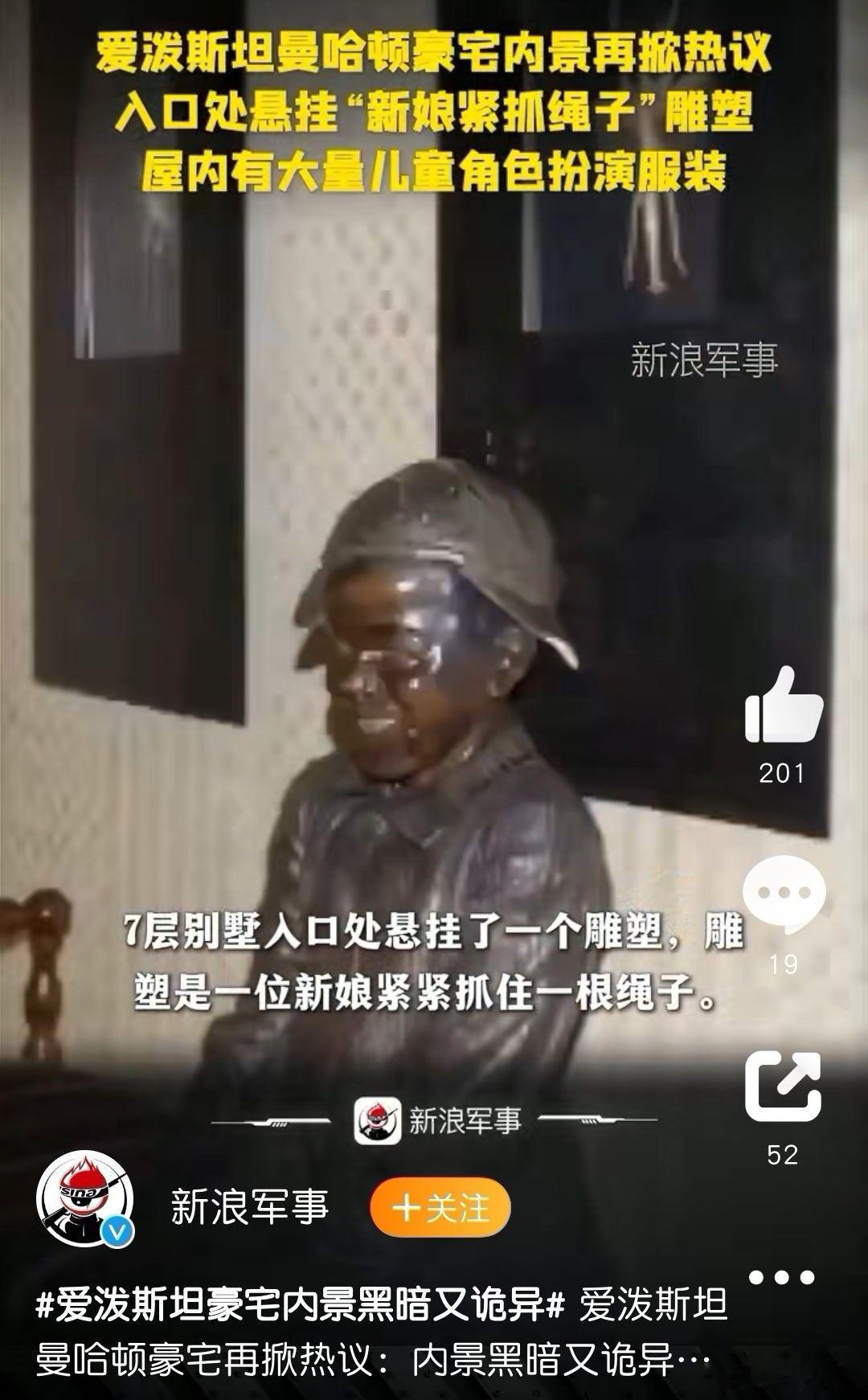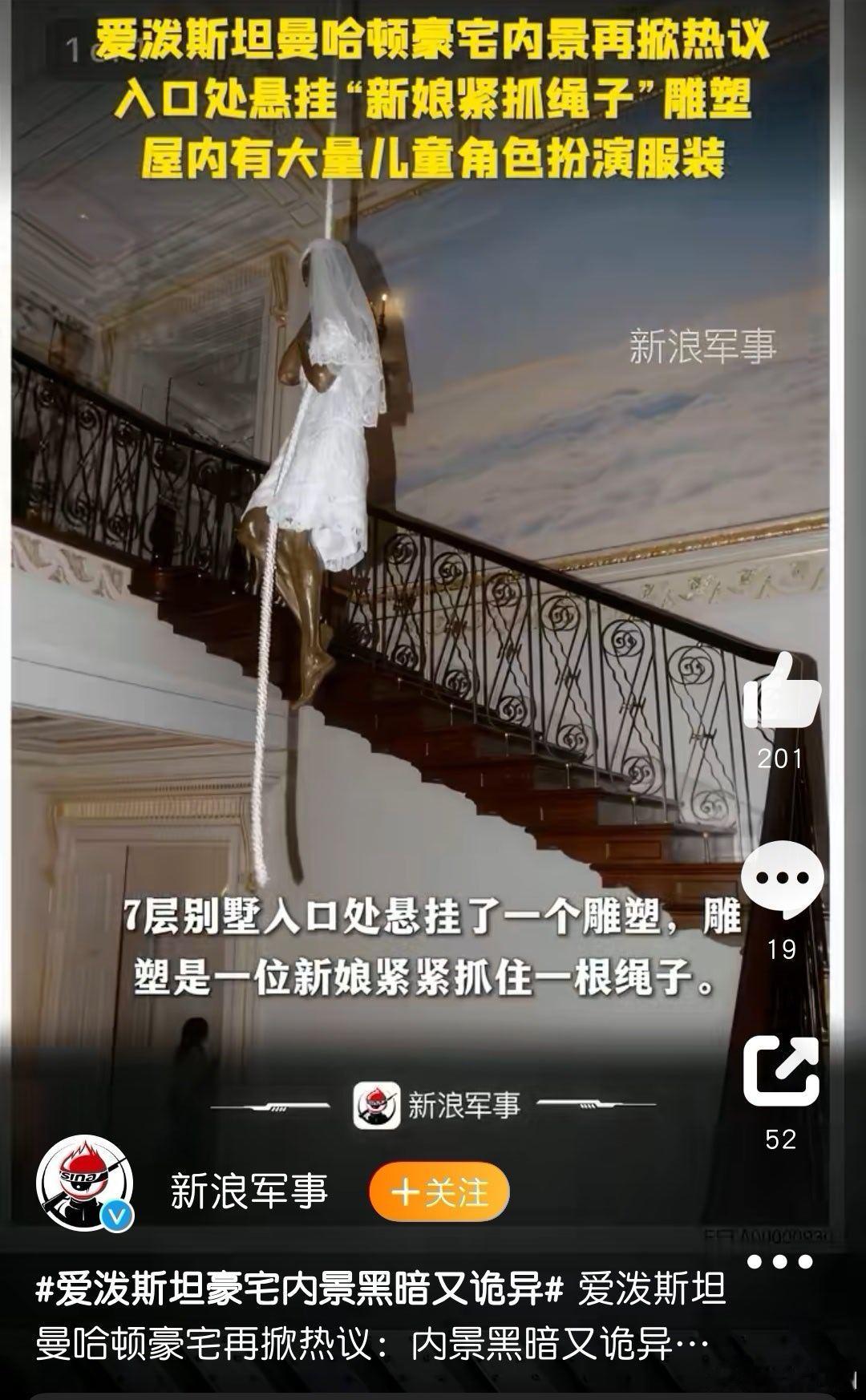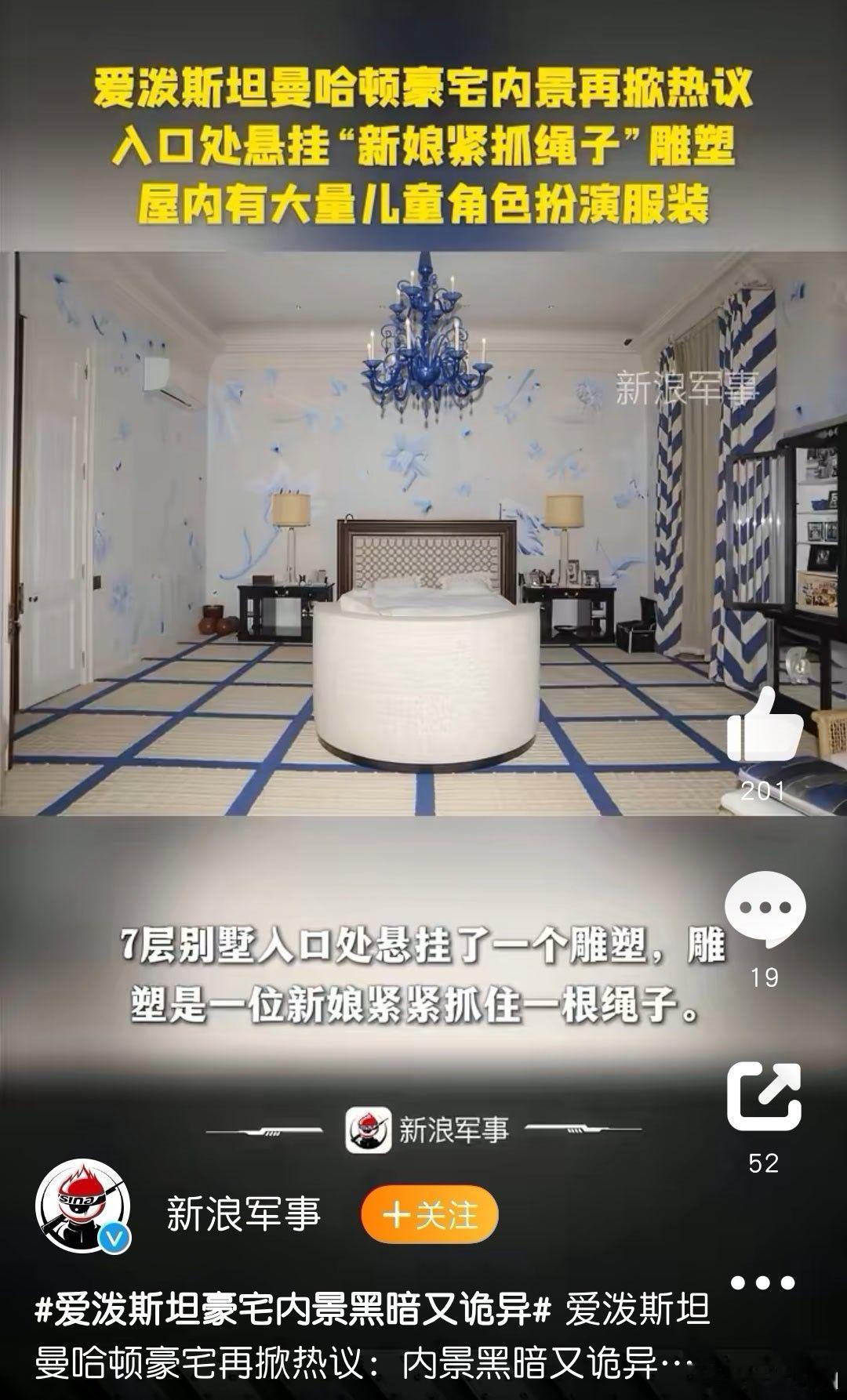 爱泼斯坦豪宅内景黑暗又诡异 看了一下是确实有一种说不出的恐怖感,特别是进门有个新娘子装扮的雕塑,感觉是有一种被虐情绪,唉!