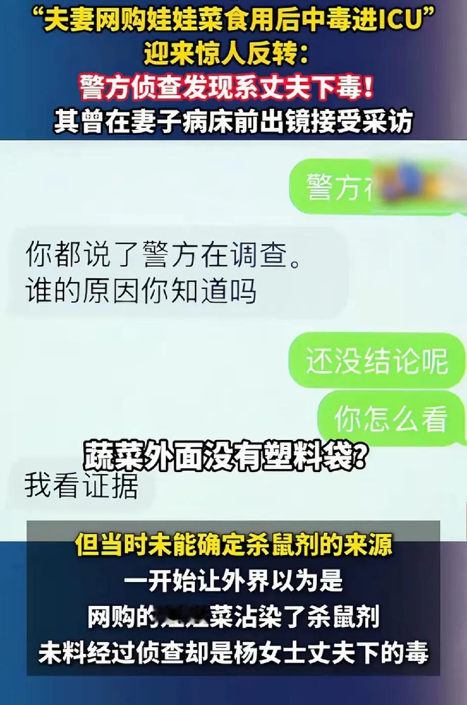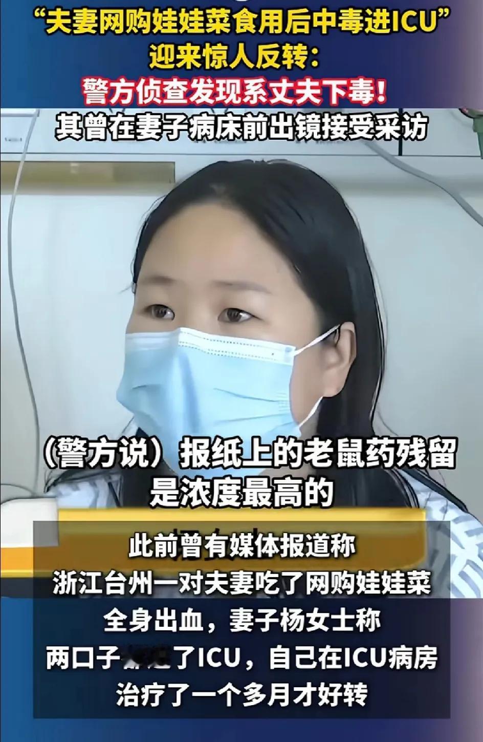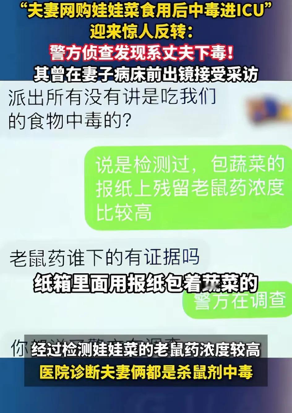 反转,再反转。食娃娃菜中毒,是夫妻二人合谋骗钱?一开始说是网购的娃娃菜包装的报纸有毒,夫妻二人都中了毒。后来又说丈夫试图毒害妻子被刑拘,现在又说是夫妻二人联手制造中毒的幌子,想骗取巨额赔偿款。那个女的都在重症监护室住了一个多月了,真的想以身试险去骗钱吗?太不可思议了吧。她身上的毒素到现在都没清除干净。据悉二人是再婚夫妻,已经结婚十几年了,平常感情还挺好。具体真相是啥?待官方通报吧
