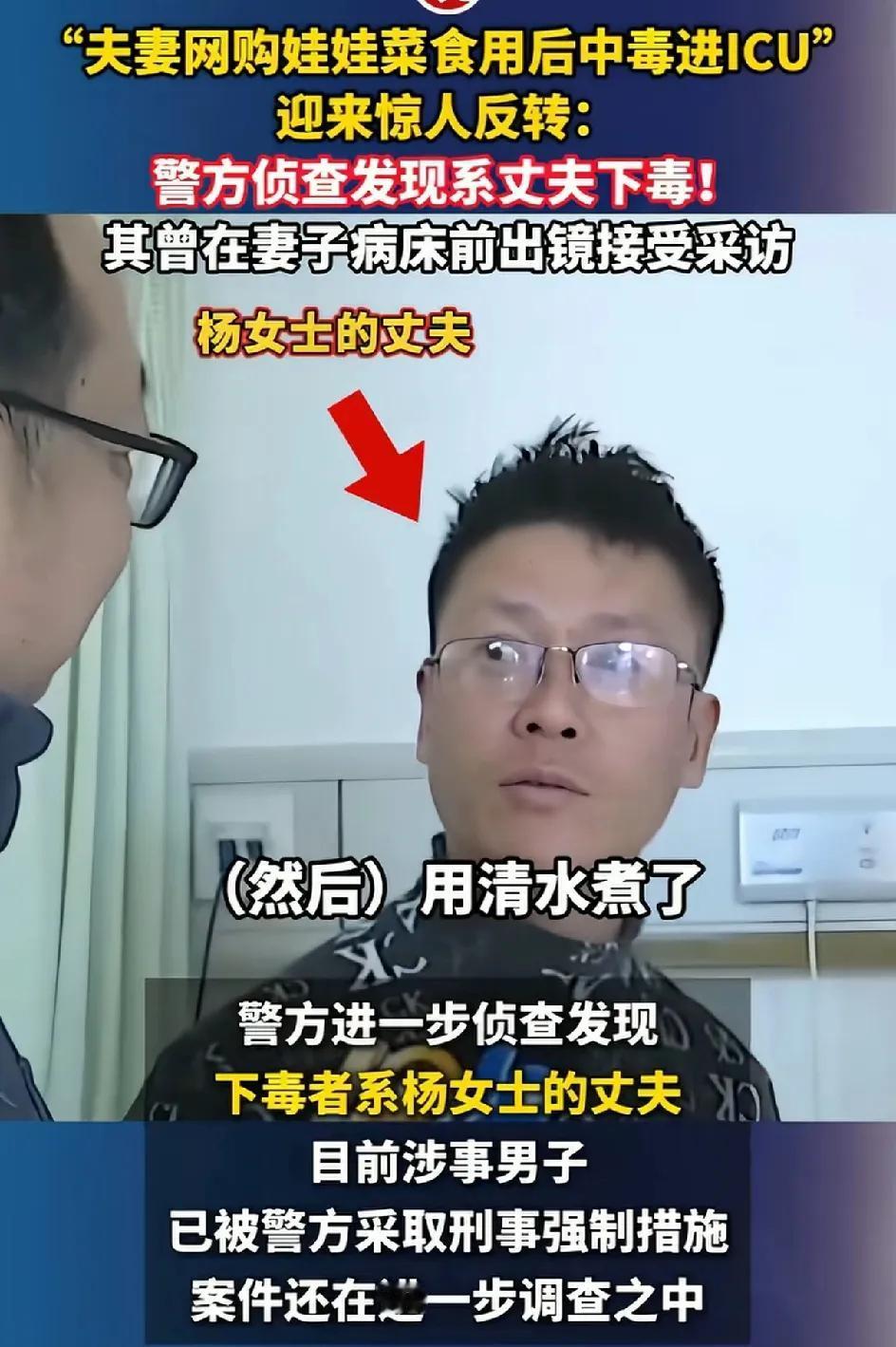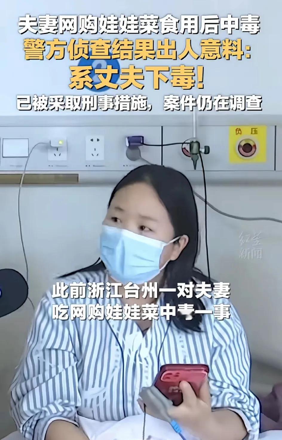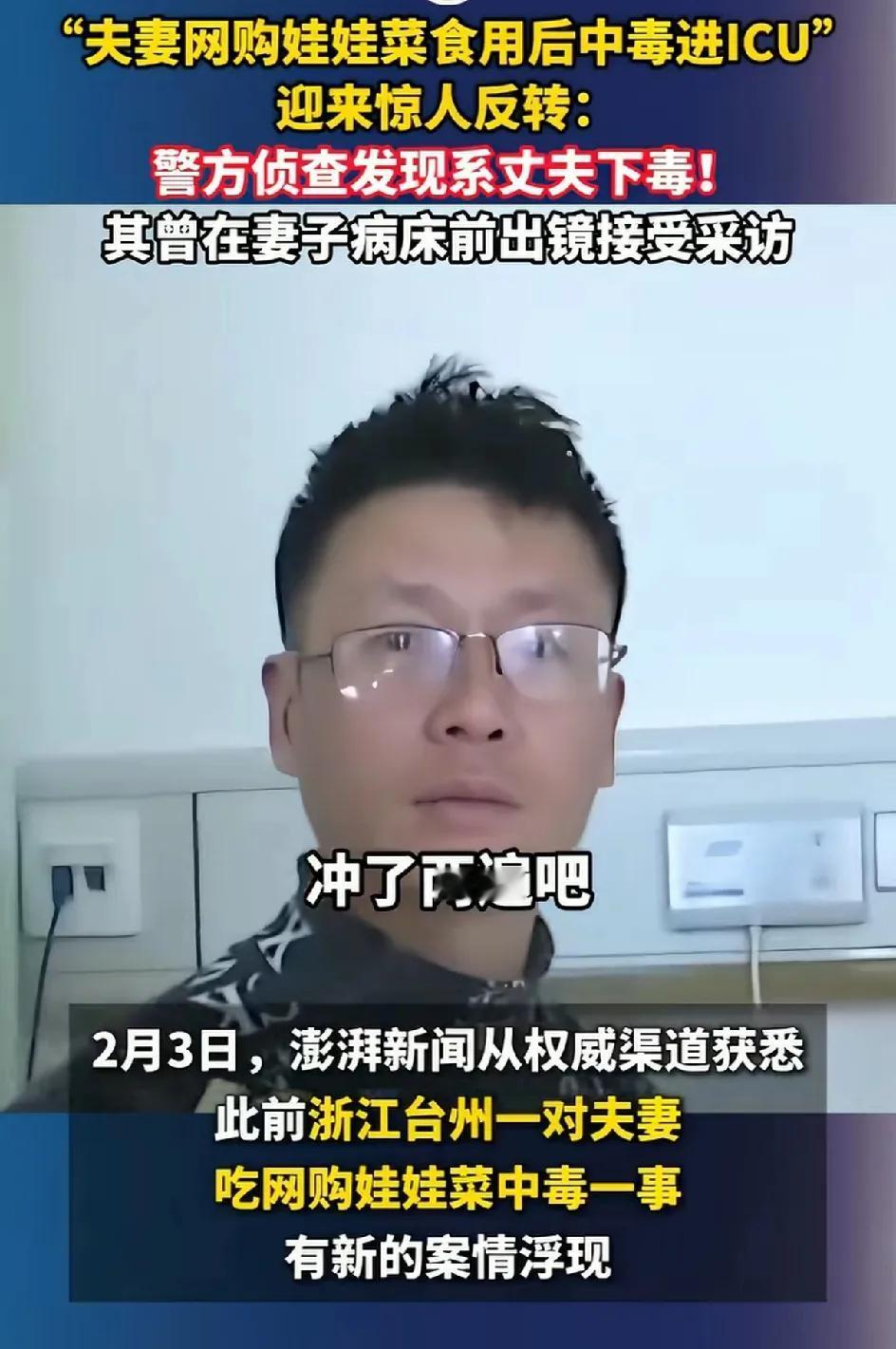 反转,再反转。食娃娃菜中毒,是夫妻二人合谋骗钱?一开始说是网购的娃娃菜包装的报纸有毒,夫妻二人都中了毒。后来又说丈夫试图毒害妻子被刑拘,现在又说是夫妻二人联手制造中毒的幌子,想骗取巨额赔偿款。那个女的都在重症监护室住了一个多月了,真的想以身试险去骗钱吗?太不可思议了吧。她身上的毒素到现在都没清除干净。据悉二人是再婚夫妻,已经结婚十几年了,平常感情还挺好。具体真相是啥?待官方通报吧