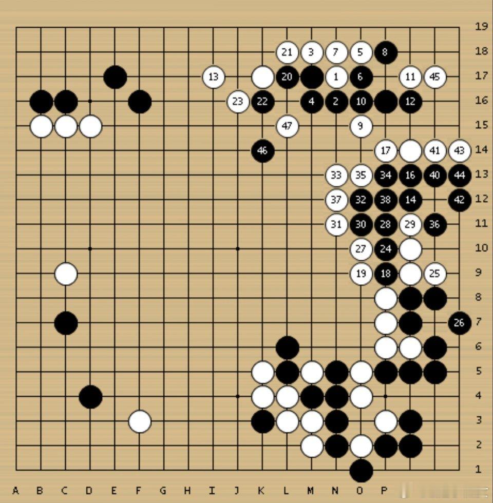 之后白33又开始撇开右上角战局,像林华已自身换陆鸣夏雪安稳,黑棋没办法只能连续挨打,但p3黑8立马反击,看起来黑棋被白棋搞得没办法,实际上十几个棋组成的棋块组成的大龙已经很成规模,而且还有一个黑50成功阻挡,就像侯军早已安排刘志军从中作梗。