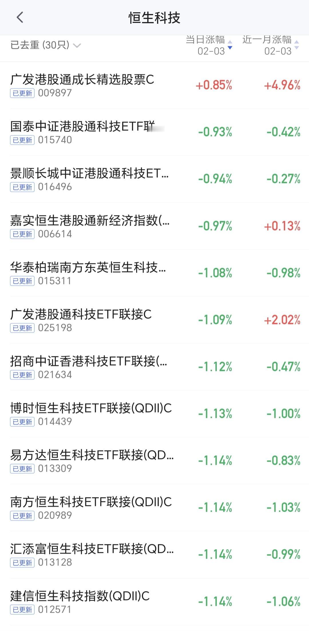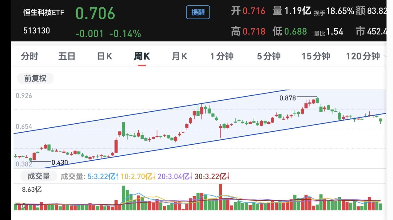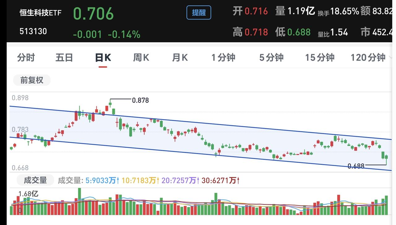 基金:恒生科技板块最近可不可以进场 香港市场今天是涨跌不一,恒生指数上涨了0.22%,国企指数下跌了0.30%,恒生科技指数下跌了1.07%。 恒生科技指数今天下跌了1.07%,这个指数今天也是探底回升,这个板块的持有人数在所有板块当中排名第13位,板块中的部分基金见下面的截图5。 看下面的截图6,这是恒生科技指数日K线图,现在的位置处于日线级别下跌通道中,短线想进场的人,需要耐心等待上涨突破这个下跌通道的上轨线,到时候再考虑要不要进场。 看下面的截图7,这是恒生科技板块周K线图,上周下跌跌破了上涨通道的下轨线,本周是在上涨通道的下方震荡,是不是有效破位,还需要继续观察,如果是有效破位,长线持有的人也是需要注意风险的。 恒生科技指数日线级别处于下跌趋势中,周线级别的上涨趋势有可能已经被破坏,不管是短线持有者,还是长线持有者,近期进场还需要谨慎。 花一秒钟点赞,花30秒钟评论,就是对我最大的支持,谢谢大家的支持。