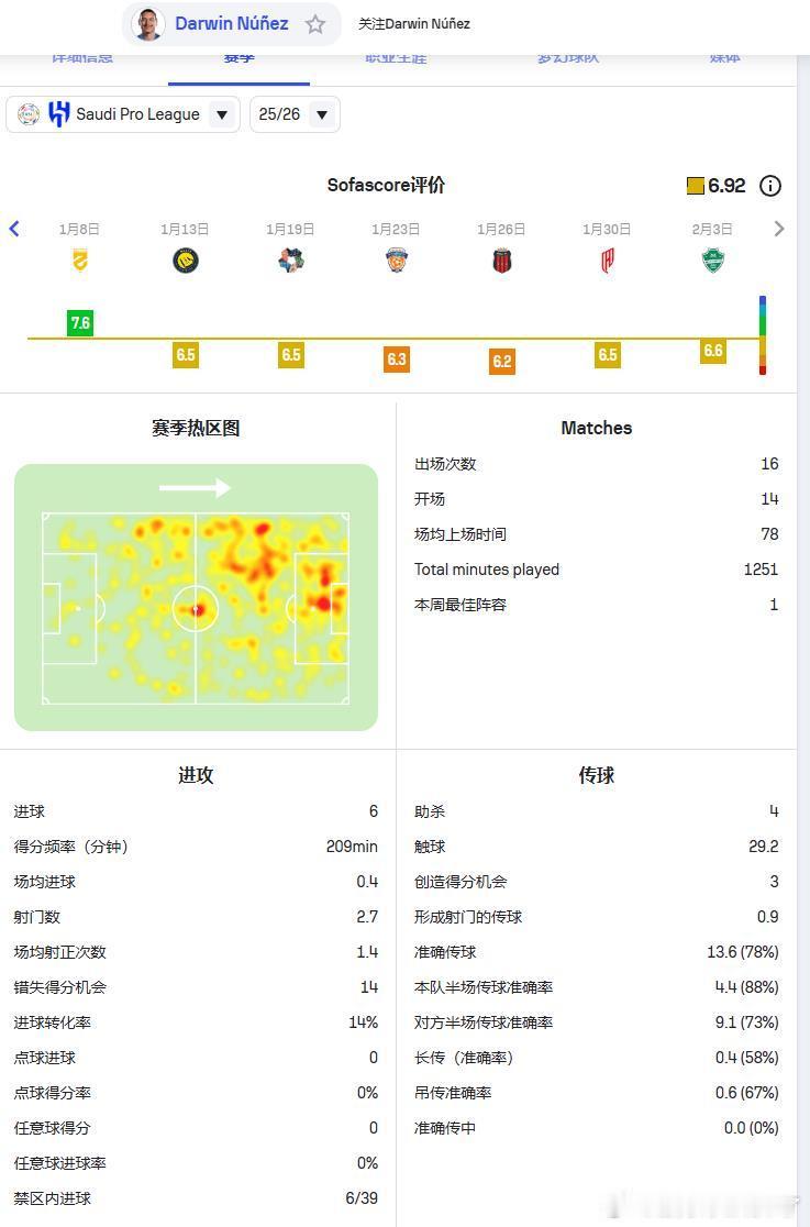 努涅斯本赛季在沙特16场比赛14次首发场均上场时间78分钟6球4助攻场均