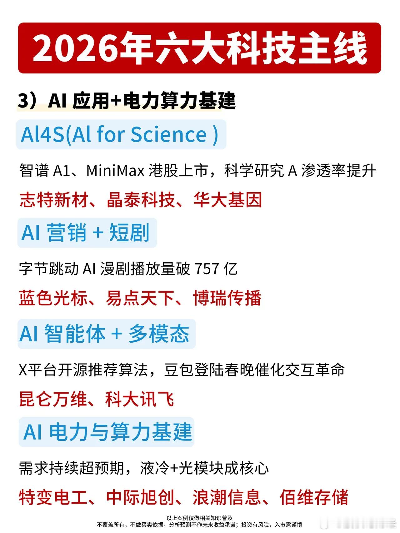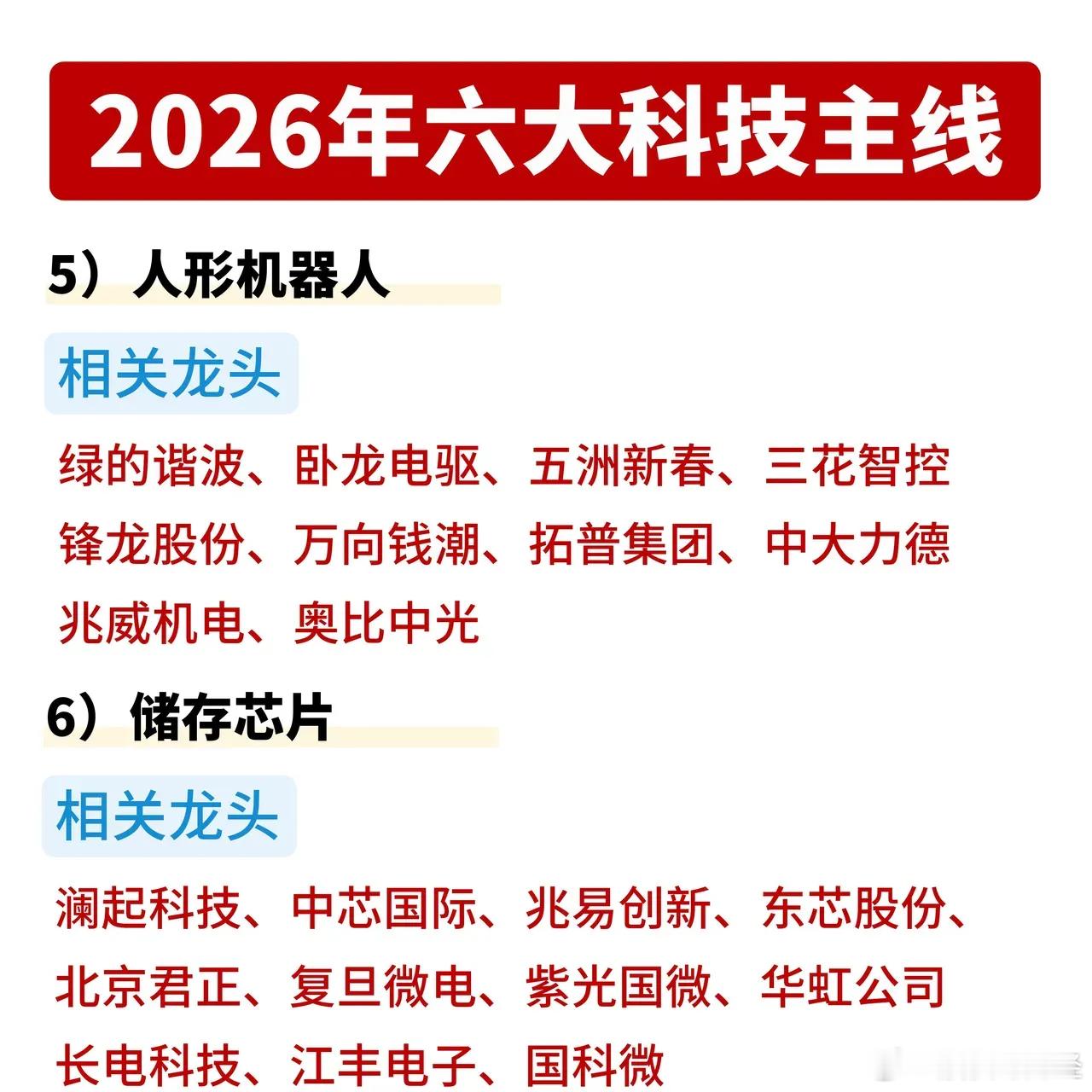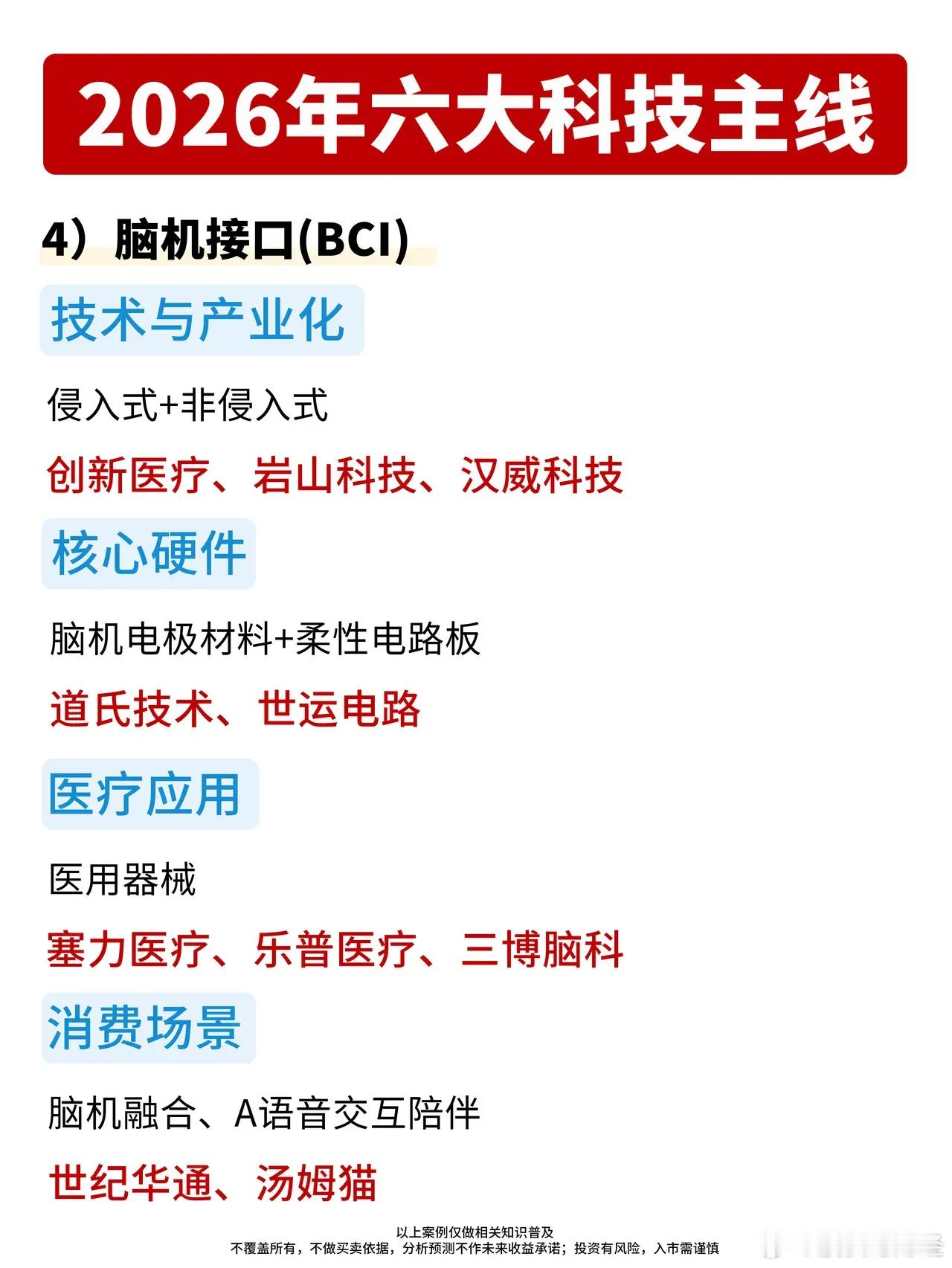 2026年六大科技主线出炉!1️⃣ 商业航天和低空经济太空算力、可回收火箭、太空光伏、低空飞行商业化全面提速,“千帆星座”首星发射在即,商业航天迎来高频发射时代。2️⃣ 贵金属与有色金属AI算力爆发带动铜、铝需求激增,白银在光伏与半导体领域的应用持续放量,小金属和稀有材料成为AI硬件升级的关键支撑。3️⃣ AI应用+电力算力基建AI for Science(AI4S)加速渗透科研领域,AI营销与短剧迎来流量爆发,液冷与光模块成为电力算力基建的核心抓手。4️⃣ 脑机接口(BCI)侵入式与非侵入式技术并行推进,核心硬件与医疗应用加速落地,消费场景下的脑机融合开启人机交互新体验。5️⃣ 人形机器人关节、驱动、传感器等核心环节技术突破,商业化落地进程加快,产业链相关龙头迎来黄金发展期。6️⃣ 储存芯片AI算力需求拉动存储芯片量价齐升,国产替代进程加速,相关企业迎来技术升级与市场扩容的双重机遇。