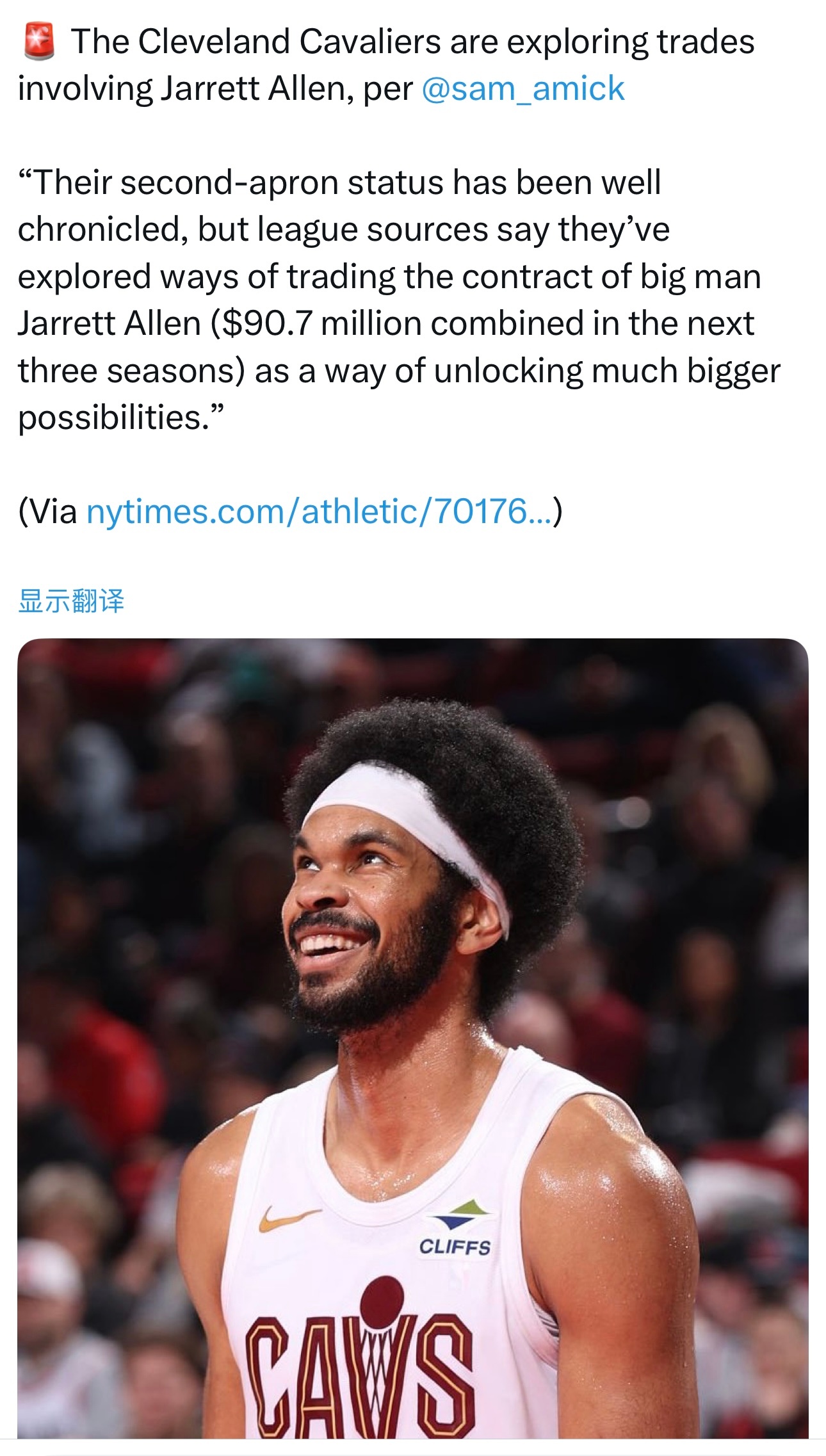 Sam Amick:骑士正在探索关于中锋贾莱特·阿伦的交易方案。