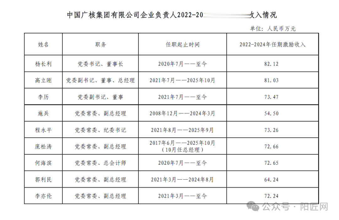 中国广核集团有限公司企业负责人2022-2024年任期激励收入情况
