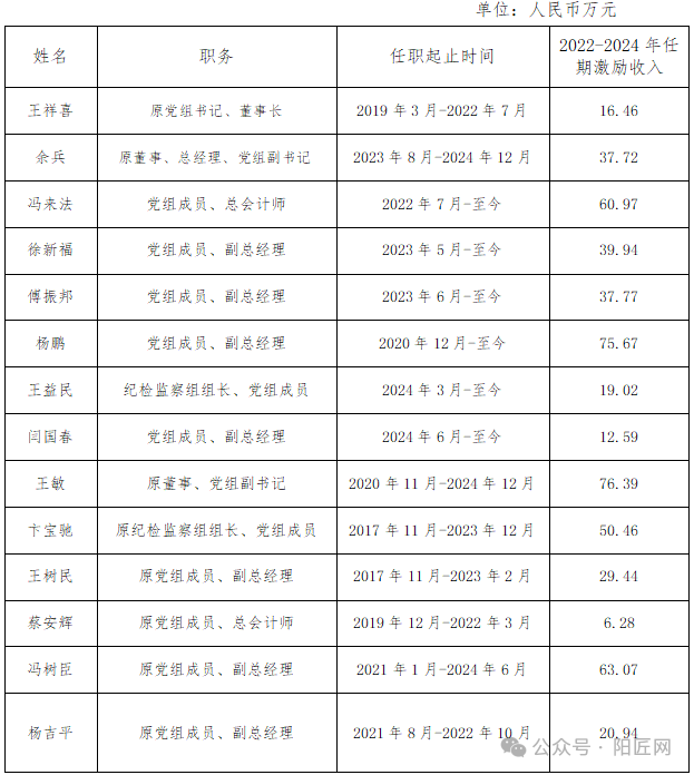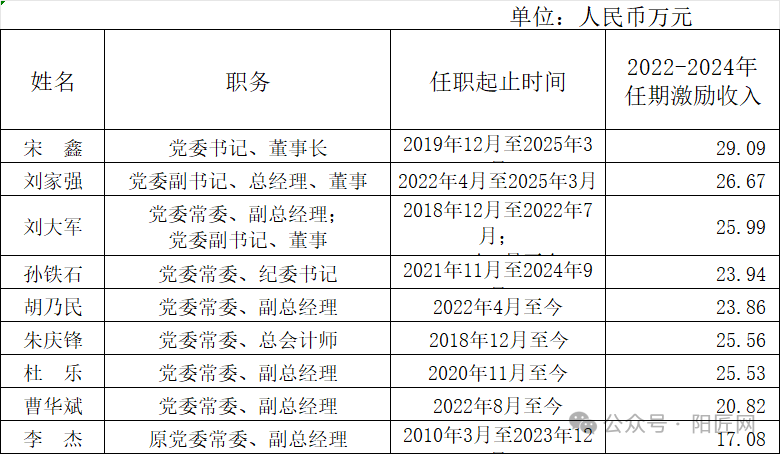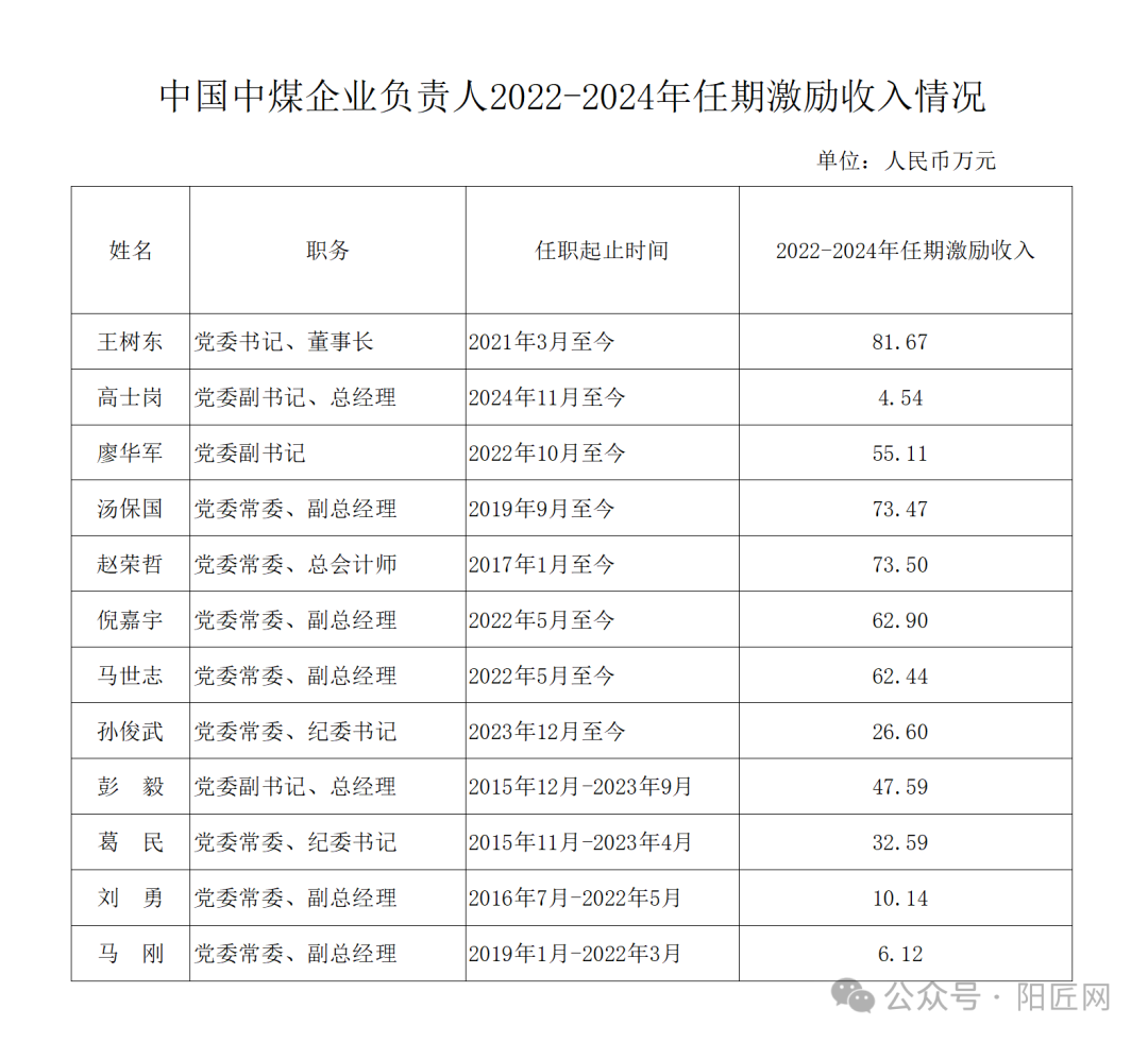 中国中煤企业负责人2022-2024年任期激励收入情况