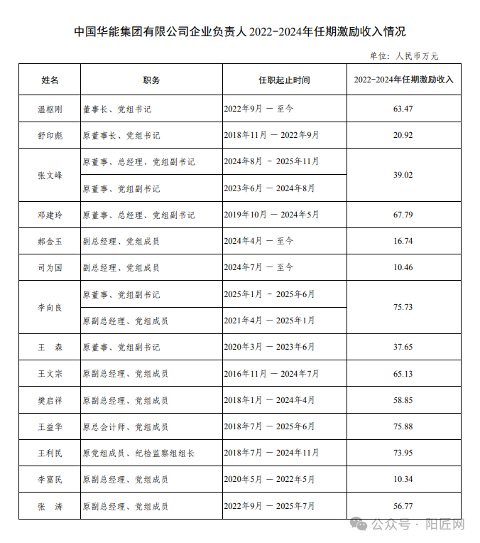 中国华能集团有限公司企业负责人2022-2024年任期激励收入情况