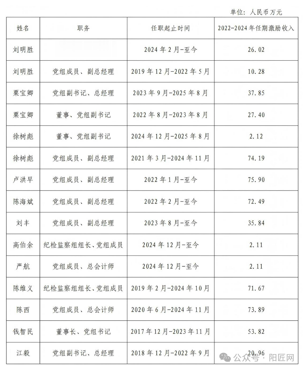 本次公布的有:国家电网、南方电网、华能、华电、大唐、国家电投、三峡、国能、中煤、中节能、中广核、中电建、中能建等央企负责人2022-2024年任期激励收入。