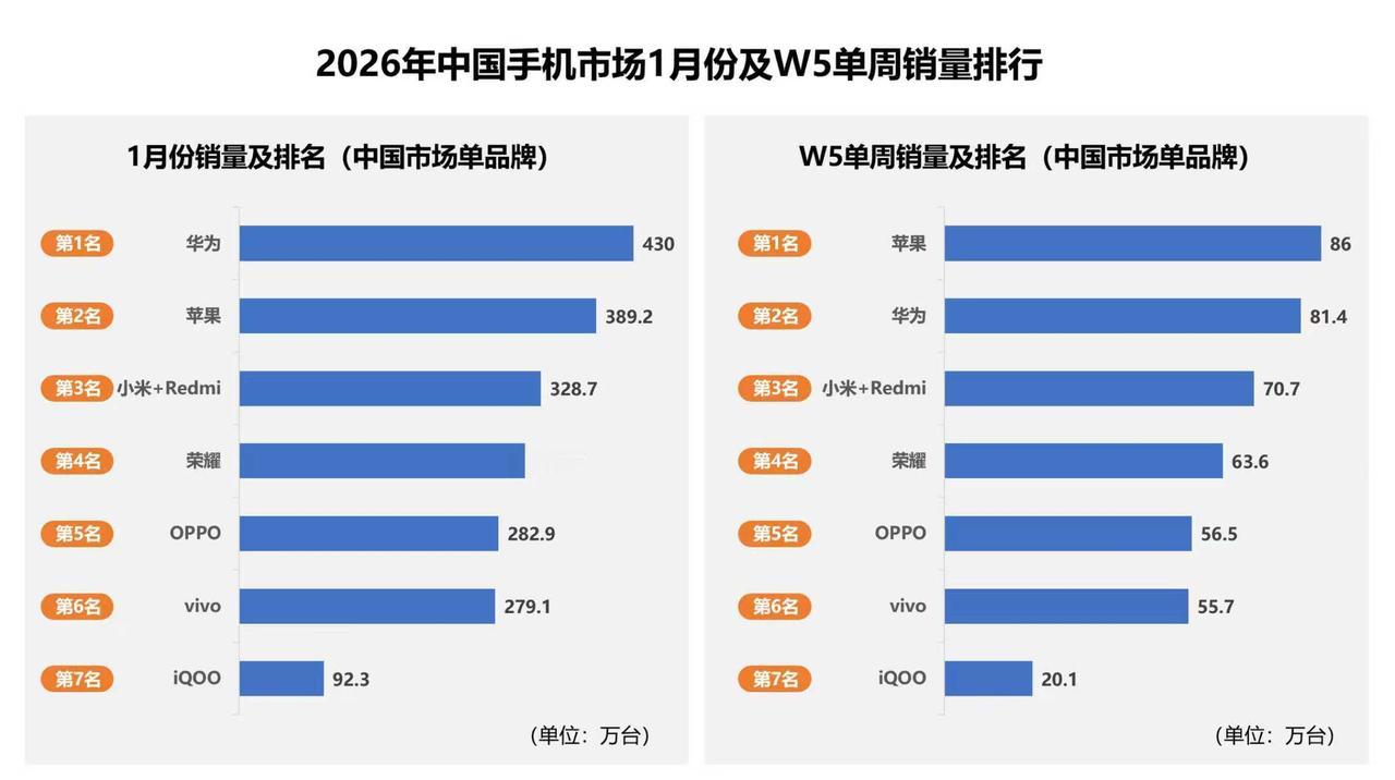 2026年开年手机市场变天了! 1月份整体销量排名:华为、苹果、小米(含Redmi)、荣耀、OPPO、vivo+iQOO。 但最后一周(W5)苹果突然反超华为冲上第一,看来年货节降价真香了? 对比去年12月,除了苹果小幅下滑,其他家都在涨。荣耀直接暴涨20%+,成1月涨幅最大的品牌——耀子这波确实支棱起来了。