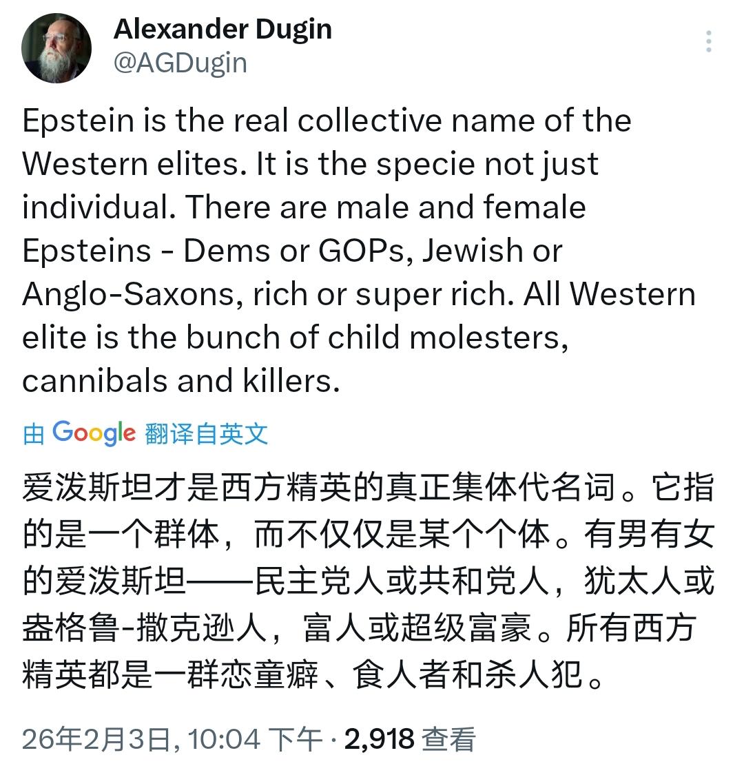 杜金向全世界发出忠告! 他提醒说,特朗普若陷入政治绝境,大概率会 “狗急跳墙” 转移焦点,动作会很猛,但路径可预判,毕竟当下他的选项可不多。核心是 “对外搞事、对内甩锅”。 杜金的猜测也并非空穴来风。暗杀四位推动法案透明化的参、众议员,目标太小,不足以产生影响力。炸了国会的确可以成为对内搞事的一个选择。 但,这只是杜金的猜测。我认为可能性不大。毕竟,没有不透风的墙,他做这事,被抓包的风险极大。一旦被抓,他的总统宝座就算做到头了。 对外,对伊朗进行核打击的风险剧增啊!虽然,美伊正在谈判中,但同时对伊朗打击,完全有可能发生,毕竟他是我们都无法预测的特朗普! 关键是伊朗完全具备完美背锅侠的潜质:软柿子,能赢,好拿捏。 Source:X