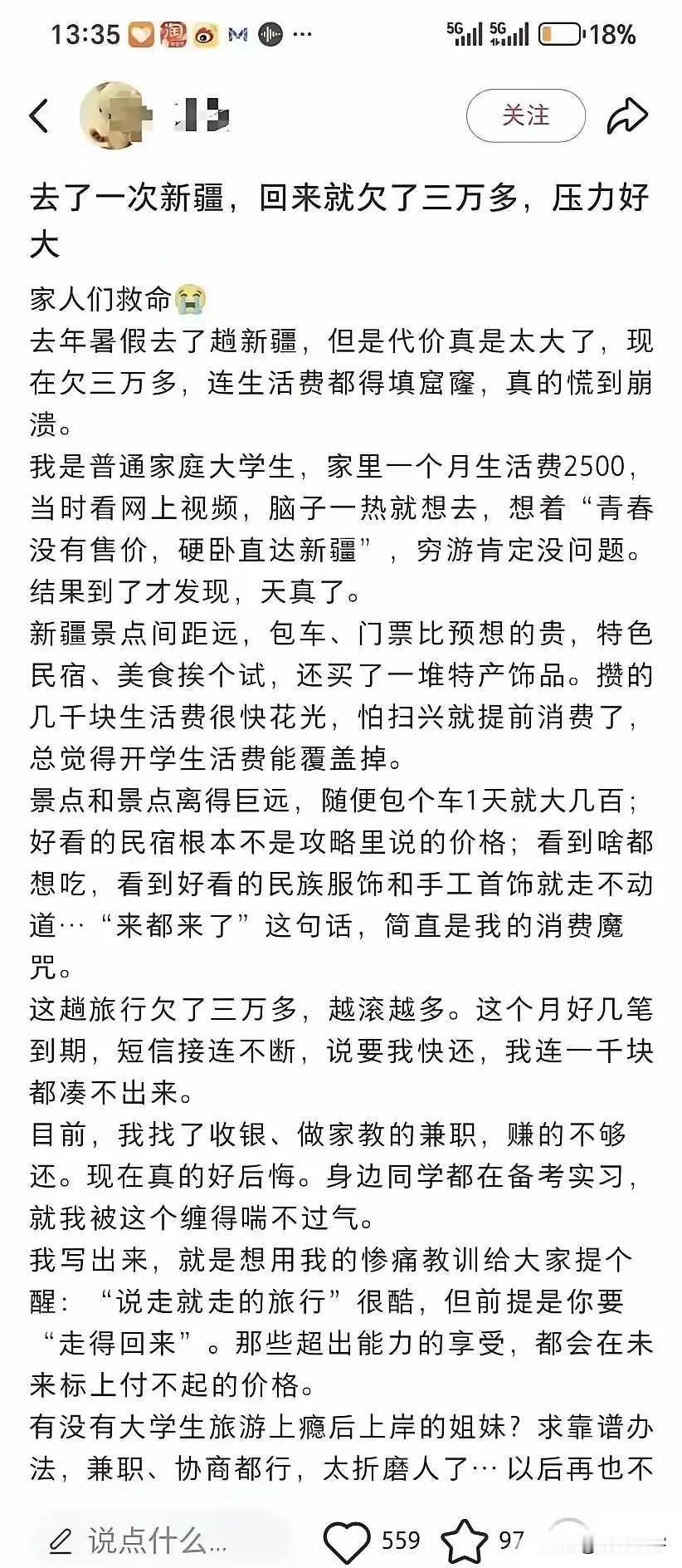 穷游的女大学生,一下子欠下三万多的贷款,而且利滚利越滚越多,催债的短信接连不断,而她连一千块钱都拿不出来!这个,一定要要引以为戒了!
