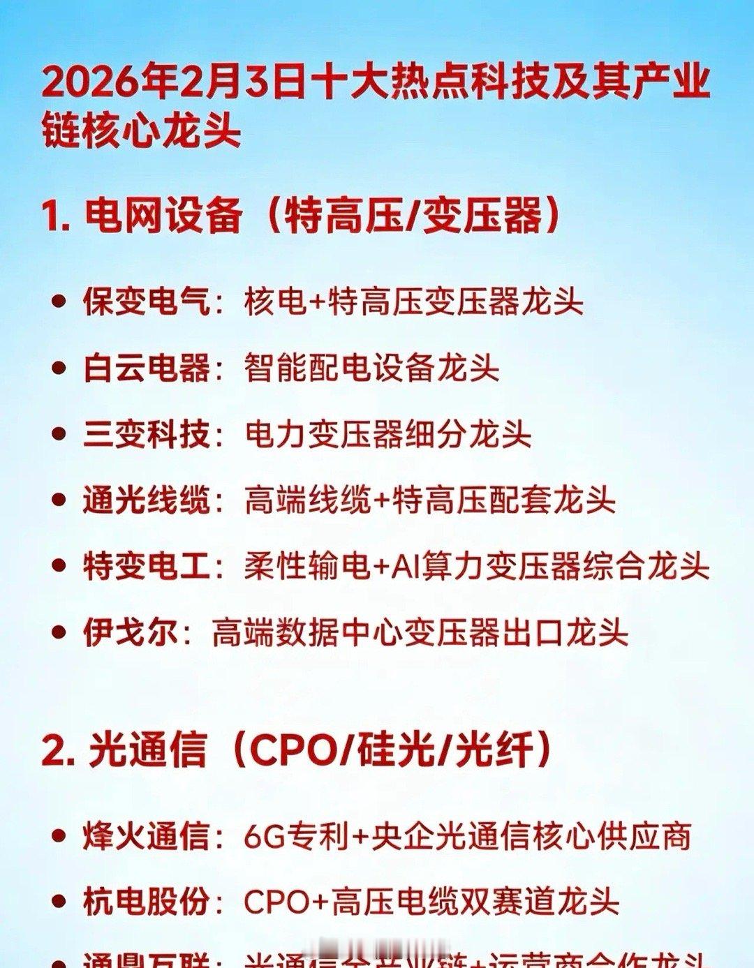 2026年2月3日十大热点科技及产业链核心龙头梳理1.电网设备(特高压/变压器