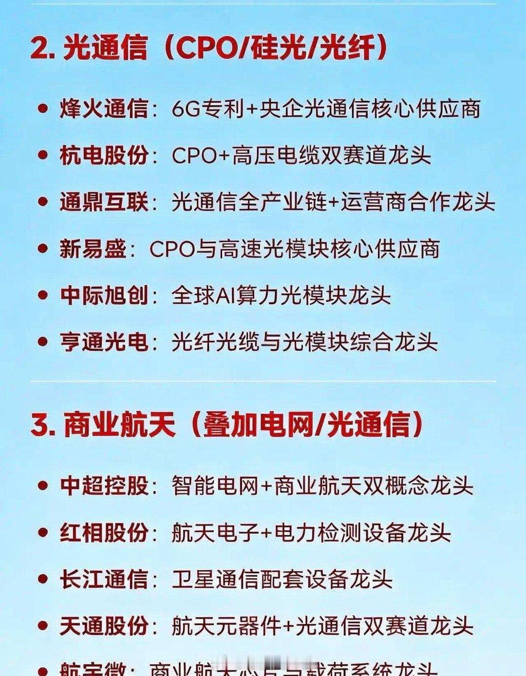 3. 商业航天(叠加电网/光通信)中超控股:智能电网与商业航天概念叠加,业务跨界融合潜力大;红相股份:航天电子与电力检测设备双轮驱动,技术适配多领域;长江通信:卫星通信配套设备核心供应商,深度参与航天通信链路建设;天通股份:航天元器件与光通信双赛道布局,技术壁垒高;航宇微:商业航天芯片与载荷系统龙头,聚焦航天器核心部件自主化。