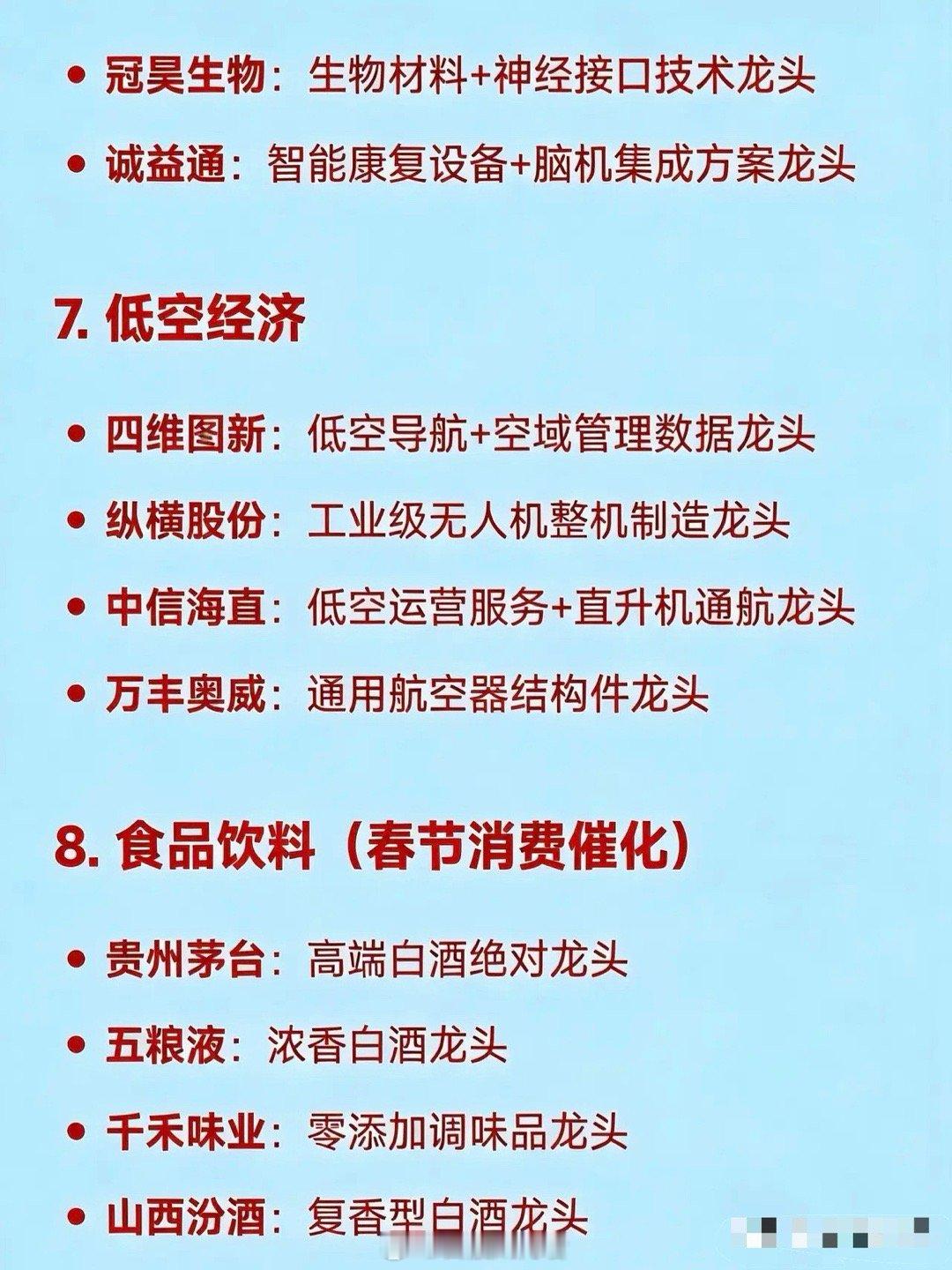8. 食品饮料(春节消费催化)贵州茅台:高端白酒绝对龙头,品牌力与稀缺性突出,春节消费核心标的;五粮液:浓香白酒领军者,产品矩阵完善,覆盖多消费层级;千禾味业:零添加调味品龙头,契合健康消费趋势,春节厨房消费需求旺盛;天味食品:复合调味料标杆,便捷性适配节日家庭烹饪场景;山西汾酒:清香型白酒龙头,品牌年轻化转型见效,春节动销可期;盐津铺子:休闲食品渠道转型成功,全品类布局覆盖节日零食需求。